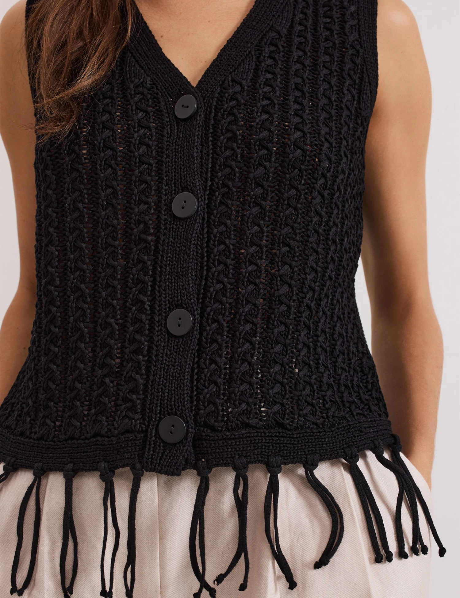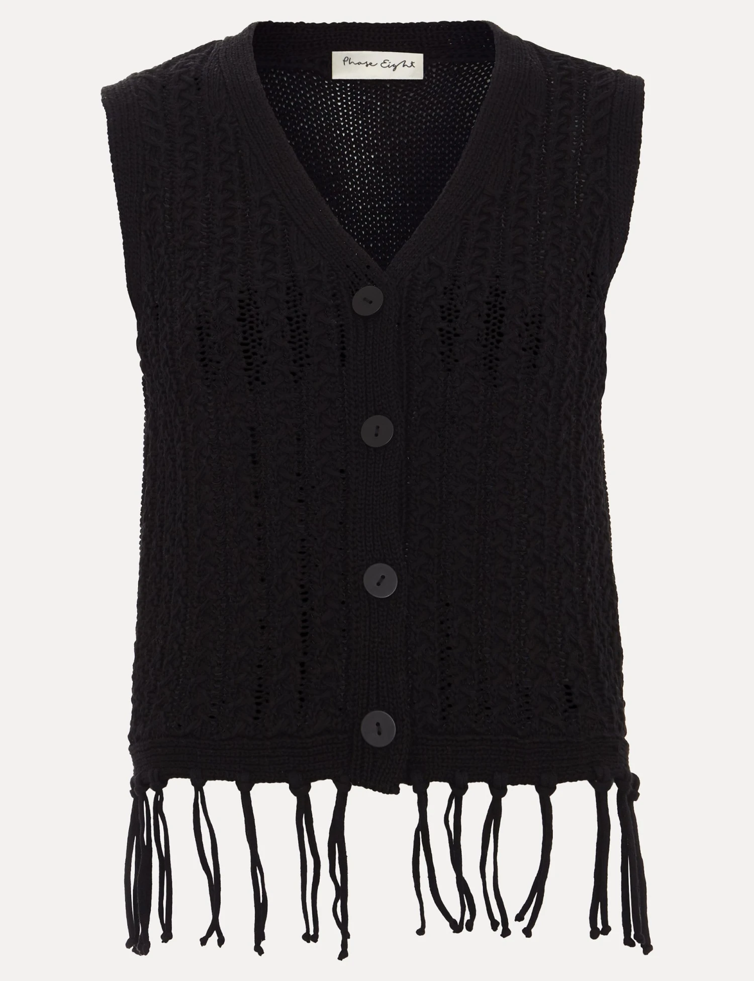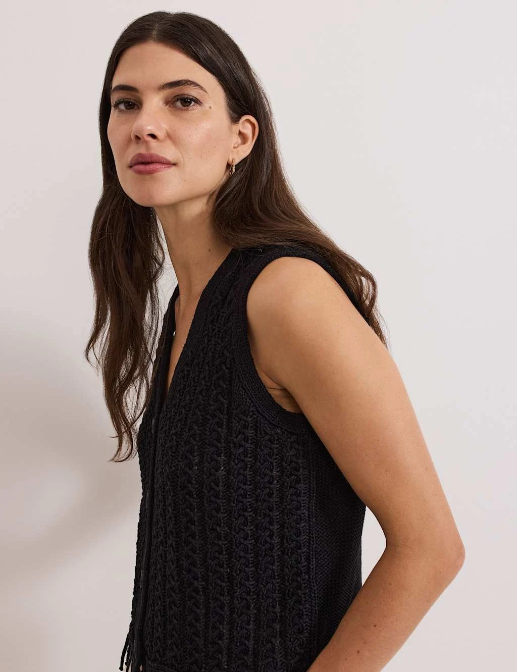 Go for a contemporary knitwear look with this stylish waistcoat from Phase Eight. It comes in a regular fit, with a v-neckline and button-through front. The chunky knit lends a tactile appeal, complemented by the boho-inspired tassel detailing around the hem.