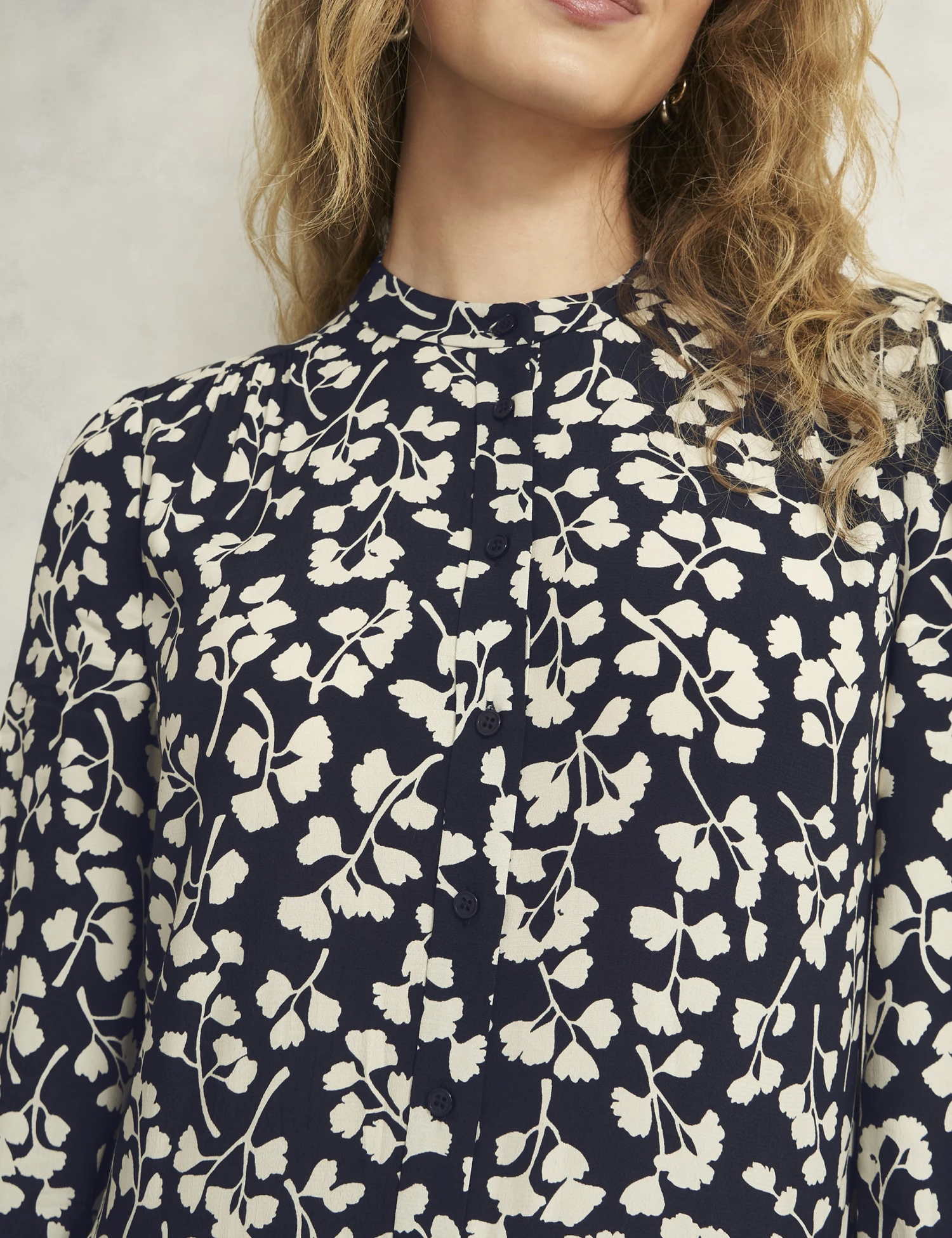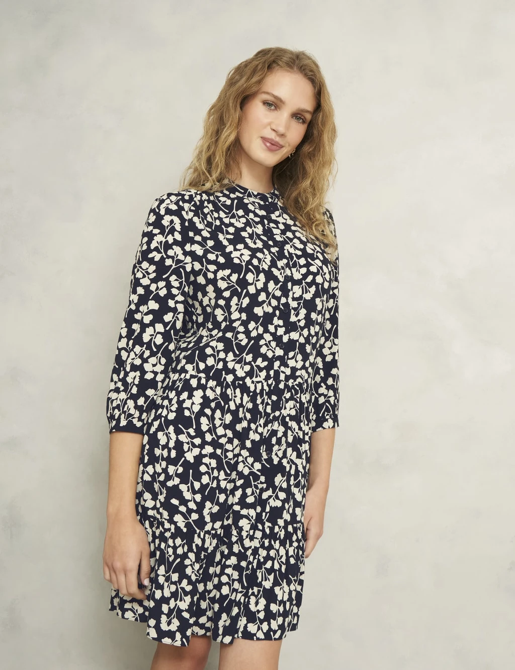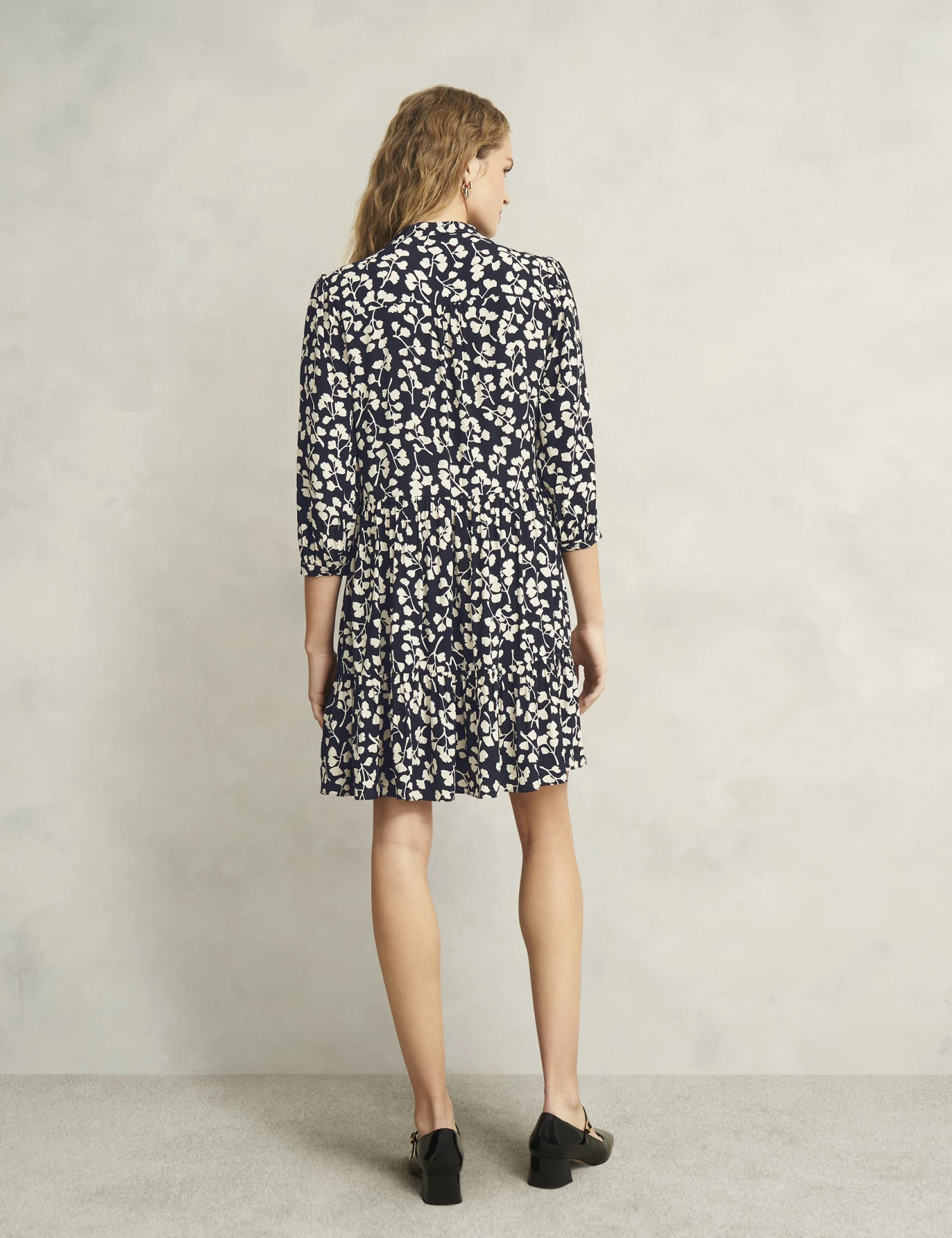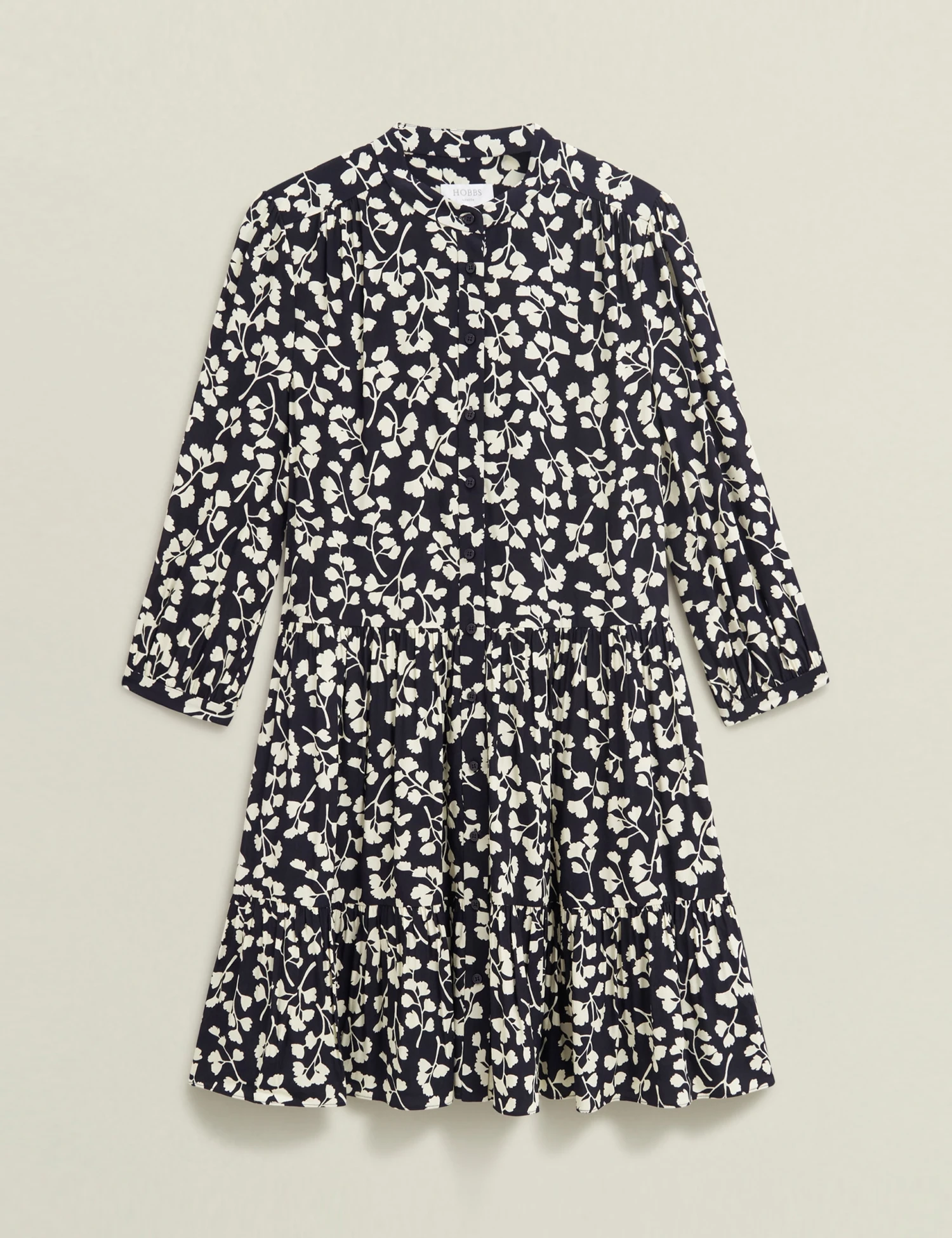 A tiered mini-length skirt brings playful movement to this Hobbs dress. It’s crafted in a regular fit, with a band collar at the crew neckline and a full-length button placket. The elegant three-quarter sleeves are puffed at the shoulder and gathered into slim cuffs, for feminine volume. A monochromatic gingko leaf print adds an eye-catching effect.