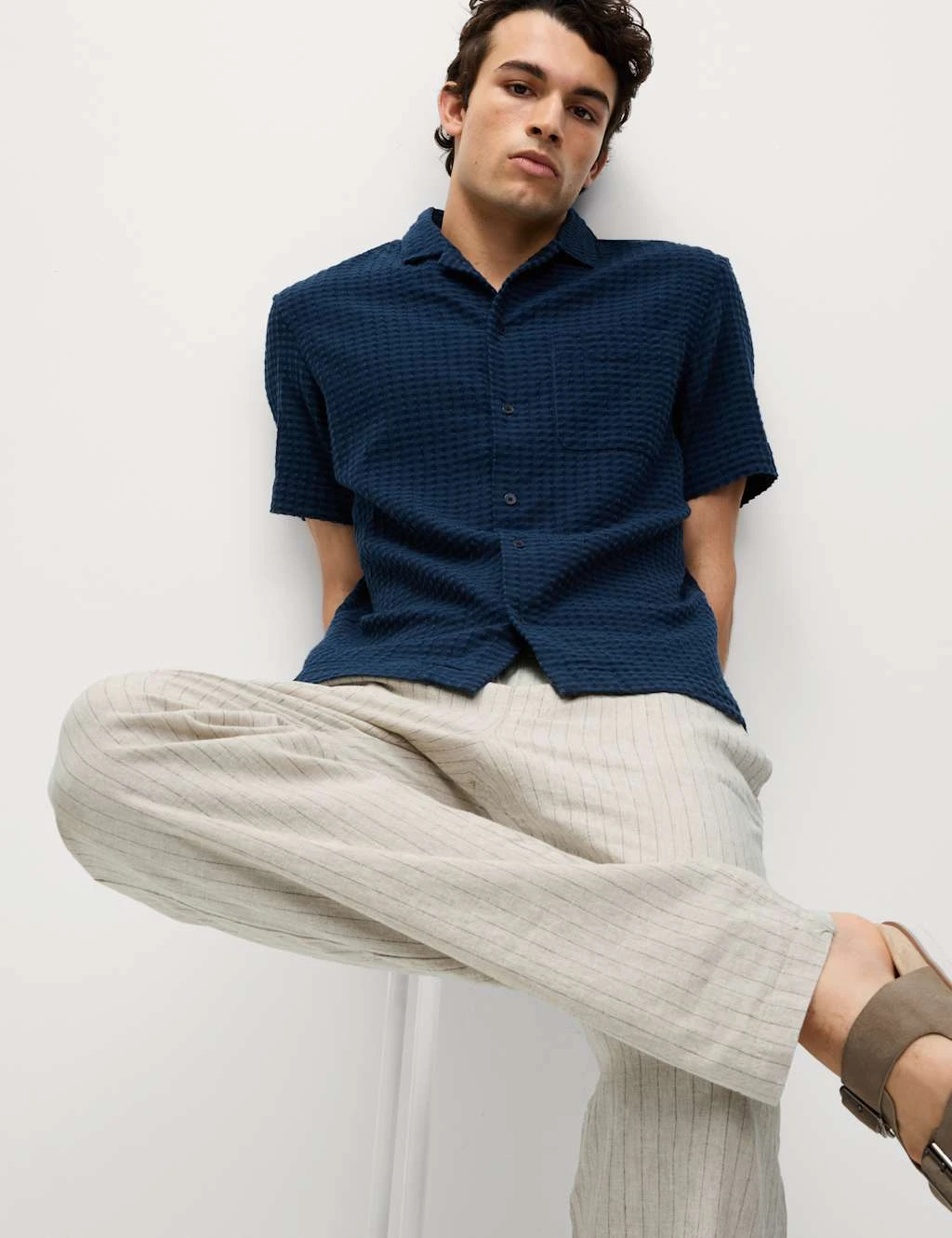 These linen-blend trousers are perfect for smart-casual summer wear. They’re made to a loose fit from a linen-cotton blend that’s lightweight and breathable, with added stretch for comfort. An elasticated waist with a drawstring fastening keeps them securely in place. The vertical striped pattern gives them a stylish look.