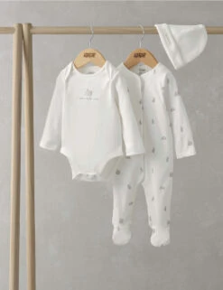This three-piece pure cotton jersey start set from Mamas & Papas is a comfy and versatile outfit choice for little ones. It comprises a long-sleeved sleepsuit with fitted feet and a short-sleeved bodysuit. Both pieces have a cute all-over bunny rabbit print and conveniently-placed popper fastenings for easy changing. There’s a branded label on the snug-fitting hat. It makes a perfect gift for newborns.
