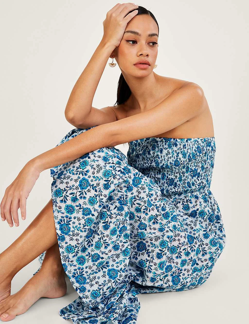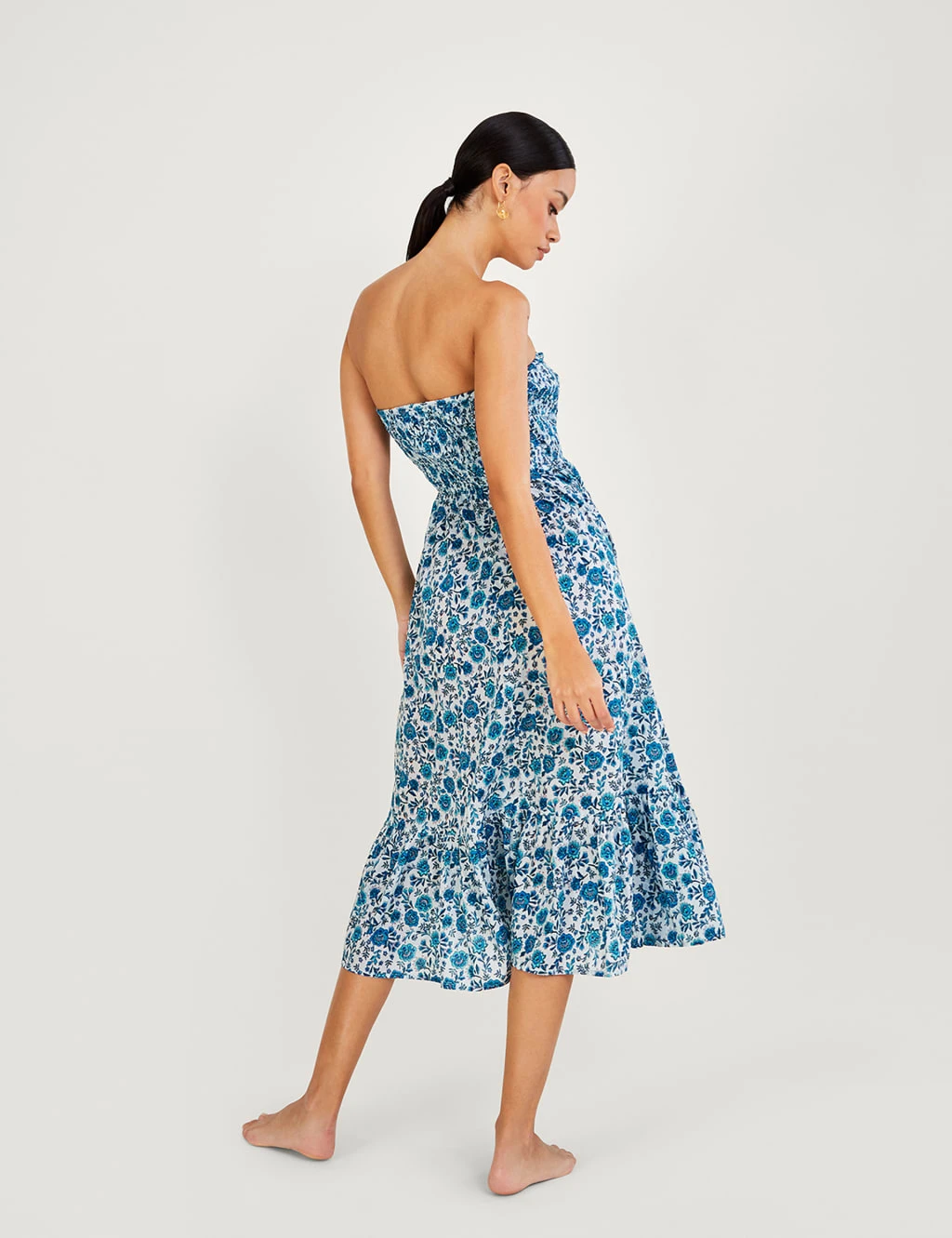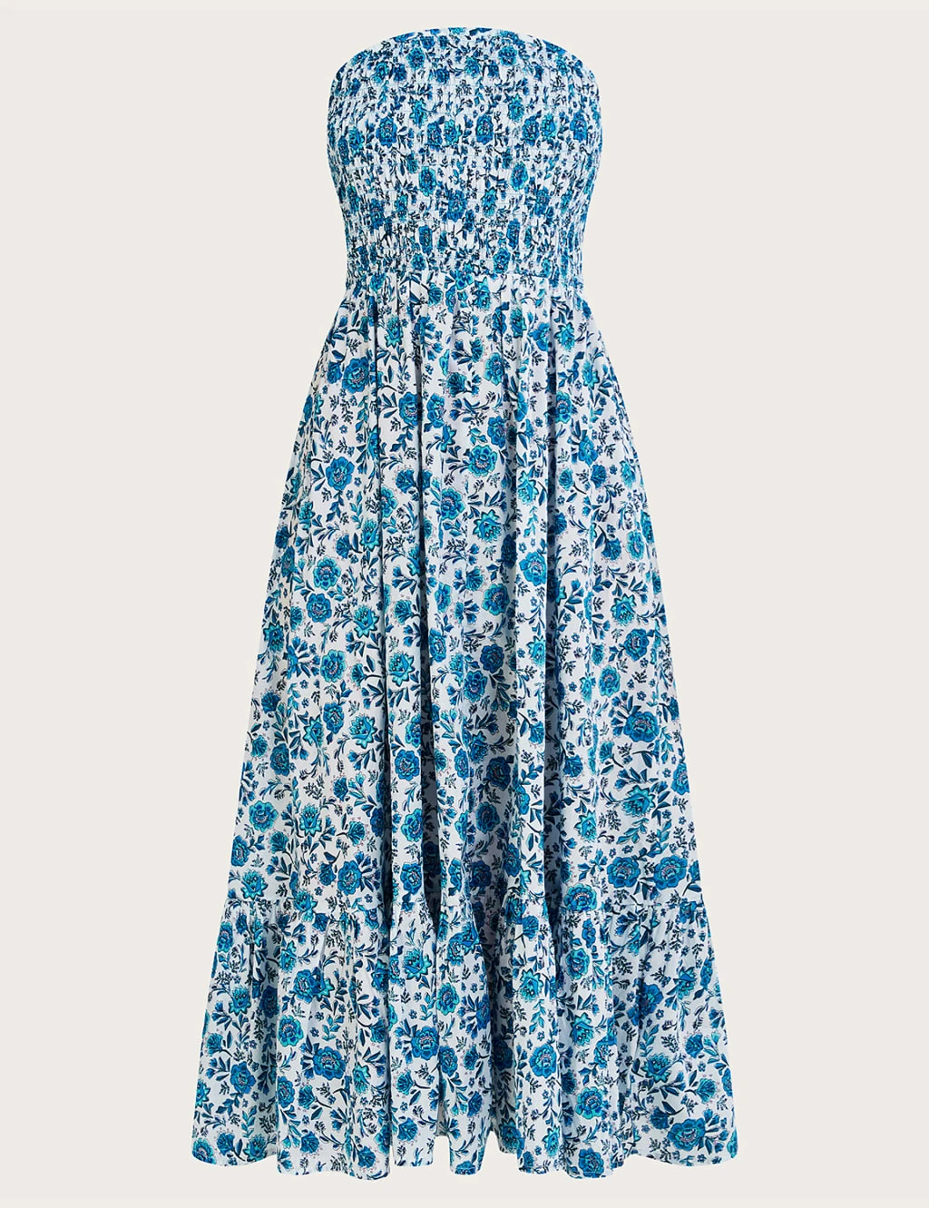 With its classic florals and bandeau shape, this pure cotton dress from Monsoon captures an elegant vintage-inspired aesthetic. It’s cut to a comfy regular fit, with a closer-fitting shirred bodice opening out into a fuller midi skirt. A frilly tier at the hem adds extra swishy movement to the dress.