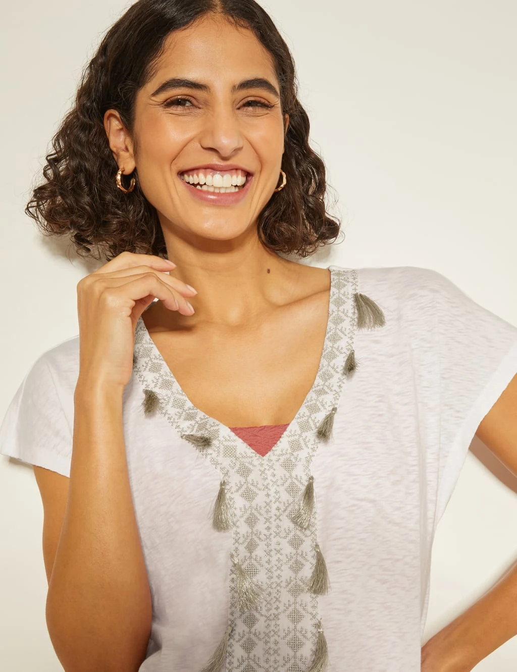 This breathable pure cotton kaftan from Monsoon is the perfect cover-up for the beach. It’s designed in a regular fit, with a flattering v-neckline and a knee-length hem. This dress features a metallic geometric pattern and shimmering tassels on the front for a luxe look.