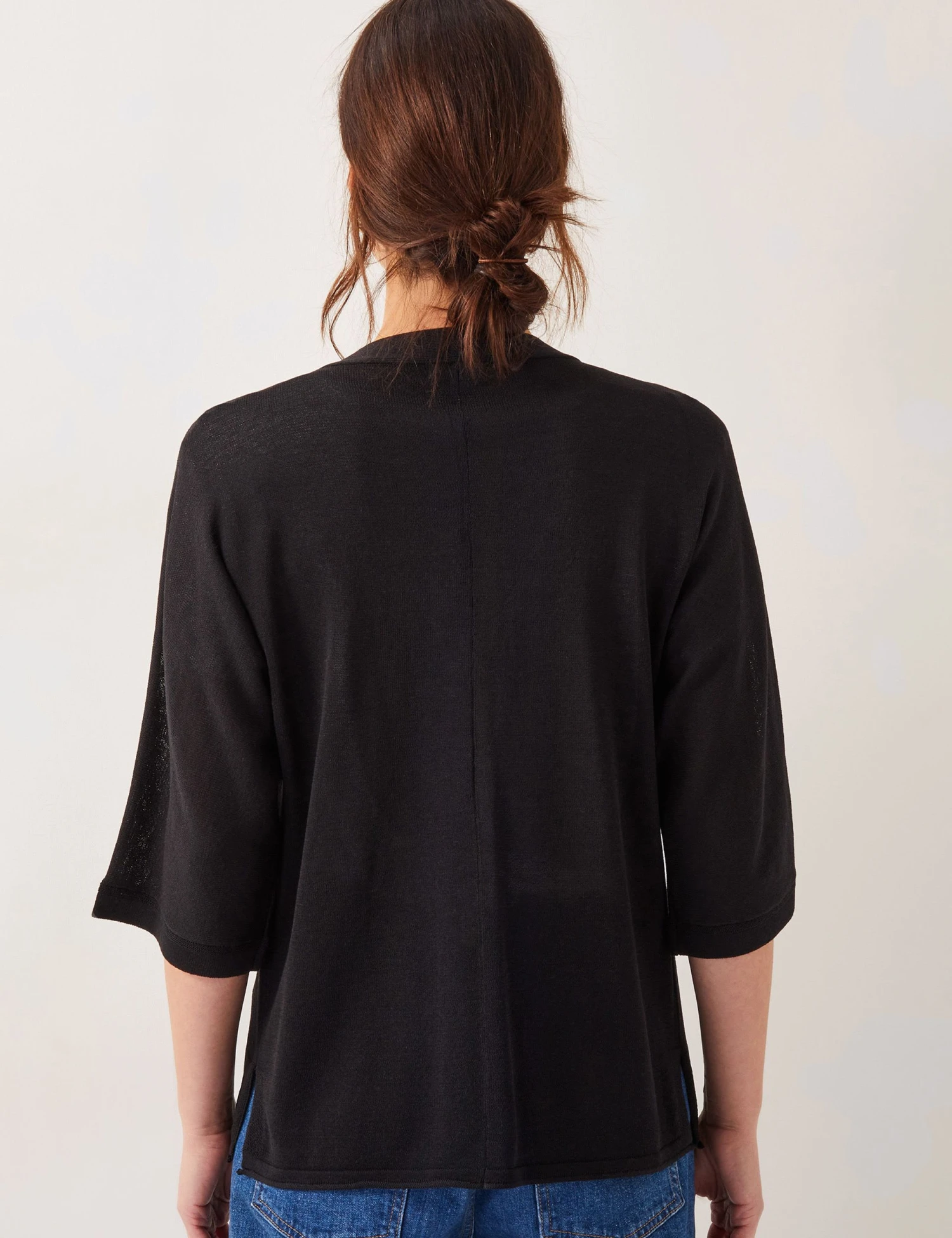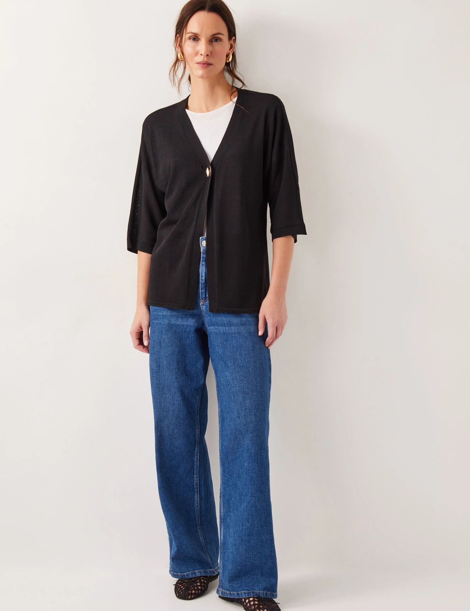 An ideal layer for warmer weather, this Monsoon cardigan is knitted with linen for a luxuriously light, breezy feel. It comes in a regular fit with a v-neckine, and fastens with a single button at the front for laid-back elegance. Three-quarter sleeves ensure a feminine silhouette.