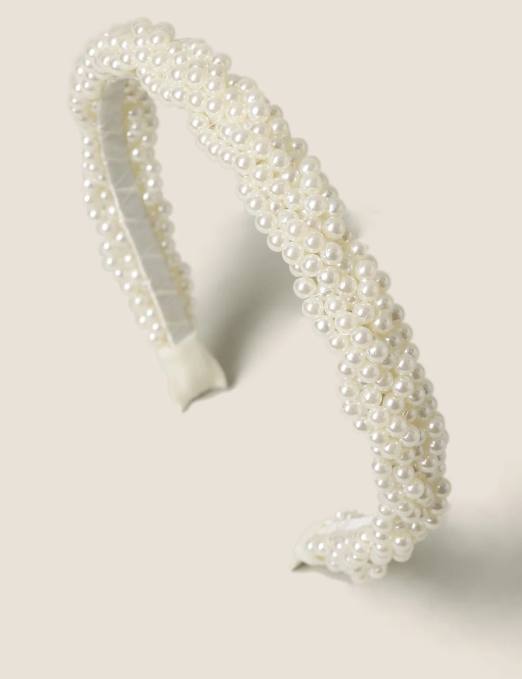 This aliceband is detailed with a row of cream faux pearls across the top of the aliceband, the pearls are intertwined in a plait style to give the extra detail to the delicate aliceband