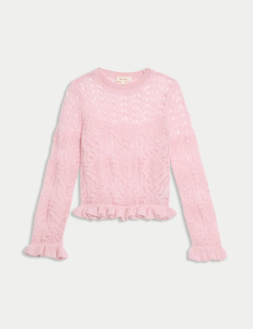 This delicate pointelle jumper from our Per Una collection is knitted with alpaca yarn for a luxuriously soft feel. It’s designed in a flattering fitted shape, with a neat crew neckline. A ruffled trim at the long-sleeve cuffs and hem add a feminine flourish, to complement the lacelike effect of this gorgeous knit. Per Una: stylish designs crafted with carefully considered details and feminine flourishes.