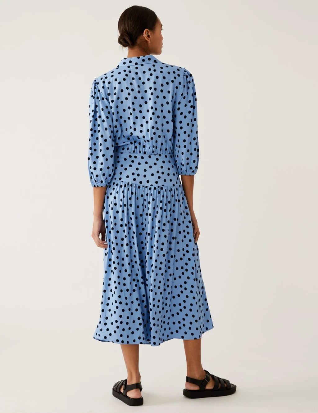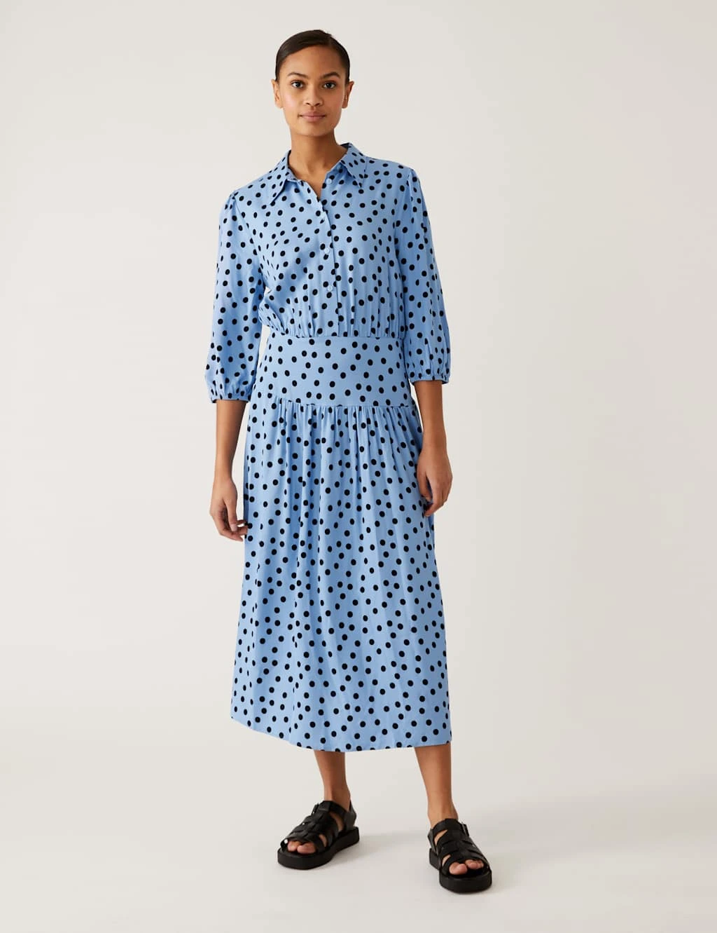 Sophisticated meets playful with this polka dot shirt dress. It’s crafted to a regular fit and features a neat collar with a delicate button fastening down to the waist. Gentle gathers at the bodice, waistline and blouson sleeves create a charmingly feminine silhouette. This piece falls to a midi length for easy elegance. M&S Collection: easy-to-wear wardrobe staples that combine classic and contemporary styles.