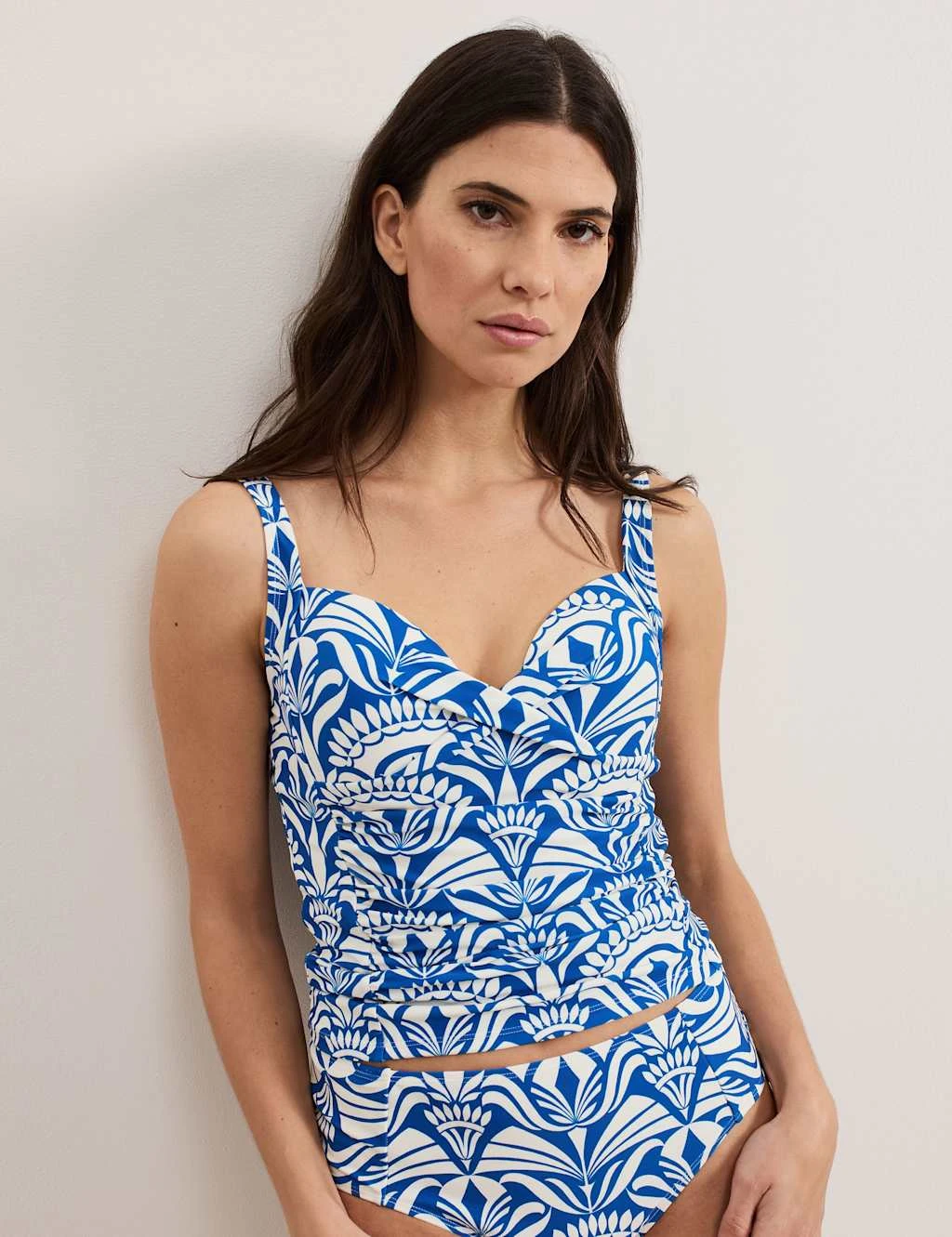 Featuring a blue and white abstract tile print, our tankini top is perfect for your next poolside getaway. With a sweetheart neckline and subtle ruching on the bodice our top is finished with adjustable shoulder straps. Wear with our matching tankini bottoms for coordinated holiday style.