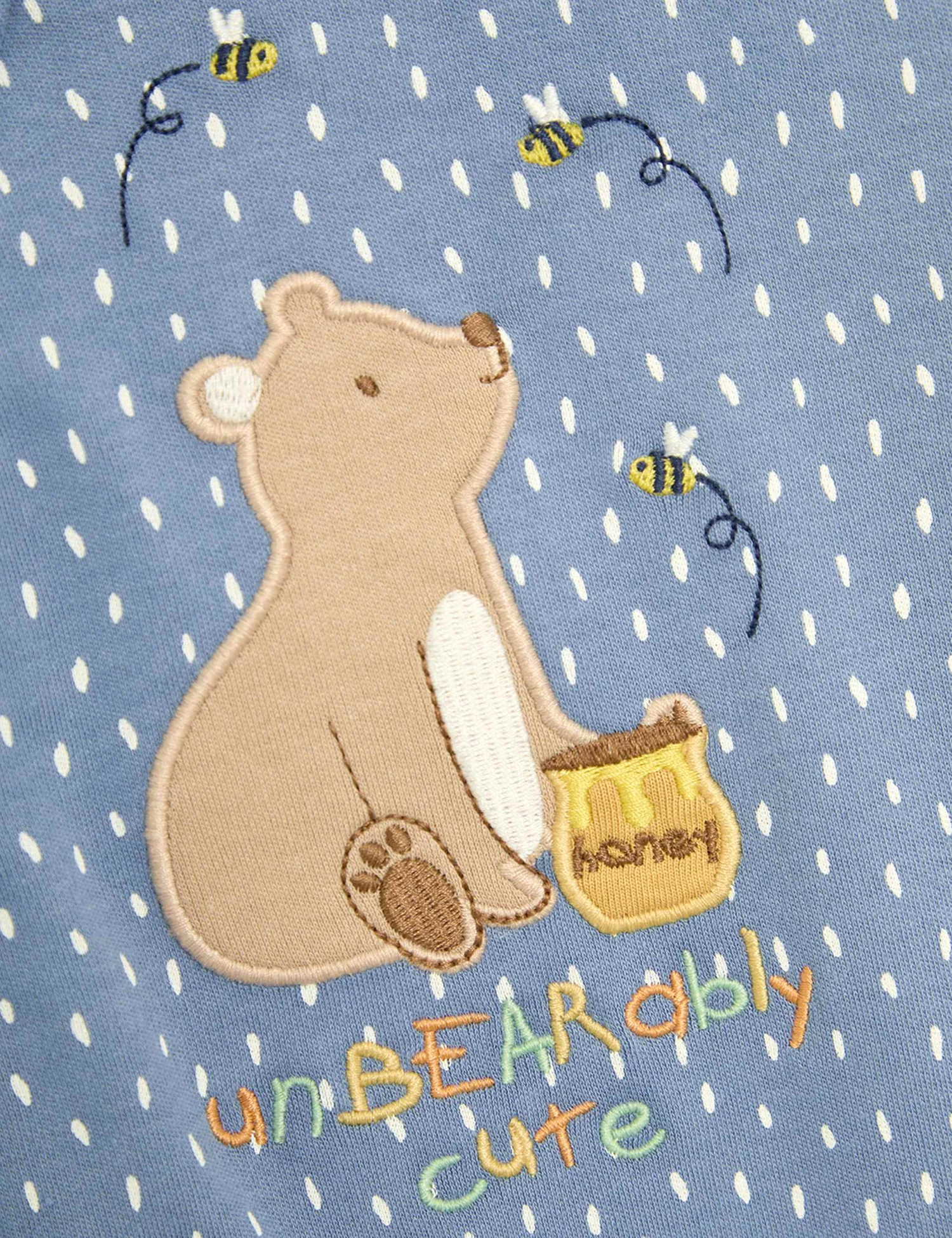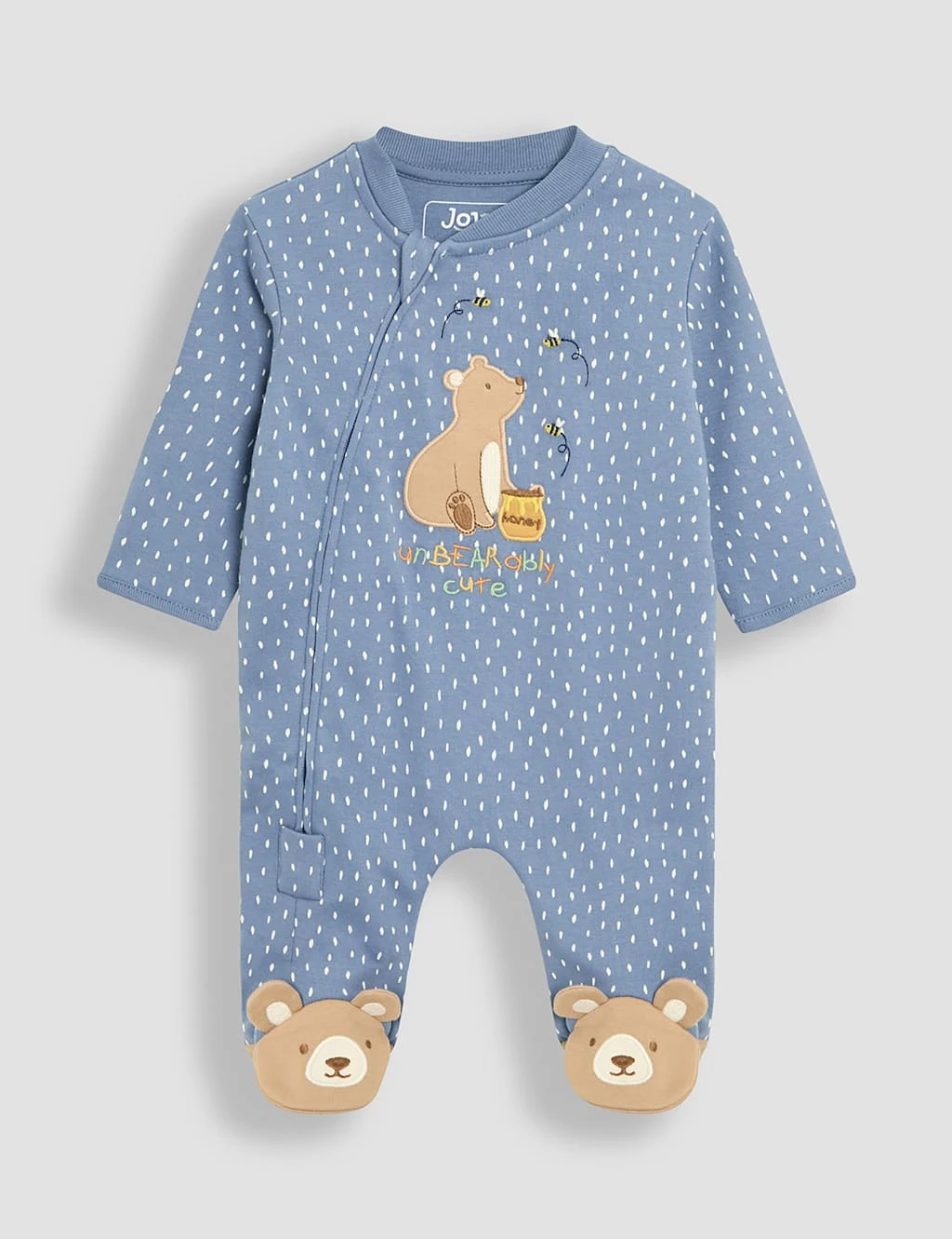 This sleepsuit from JoJo Maman Bébé is crafted from pure cotton for a gentle feel. It’s designed with scratch mitts on the long sleeves and integrated feet. A full-length zip makes dressing quick and easy. Bear appliqué and faces with 3D ears make this style ‘unbearably cute’.