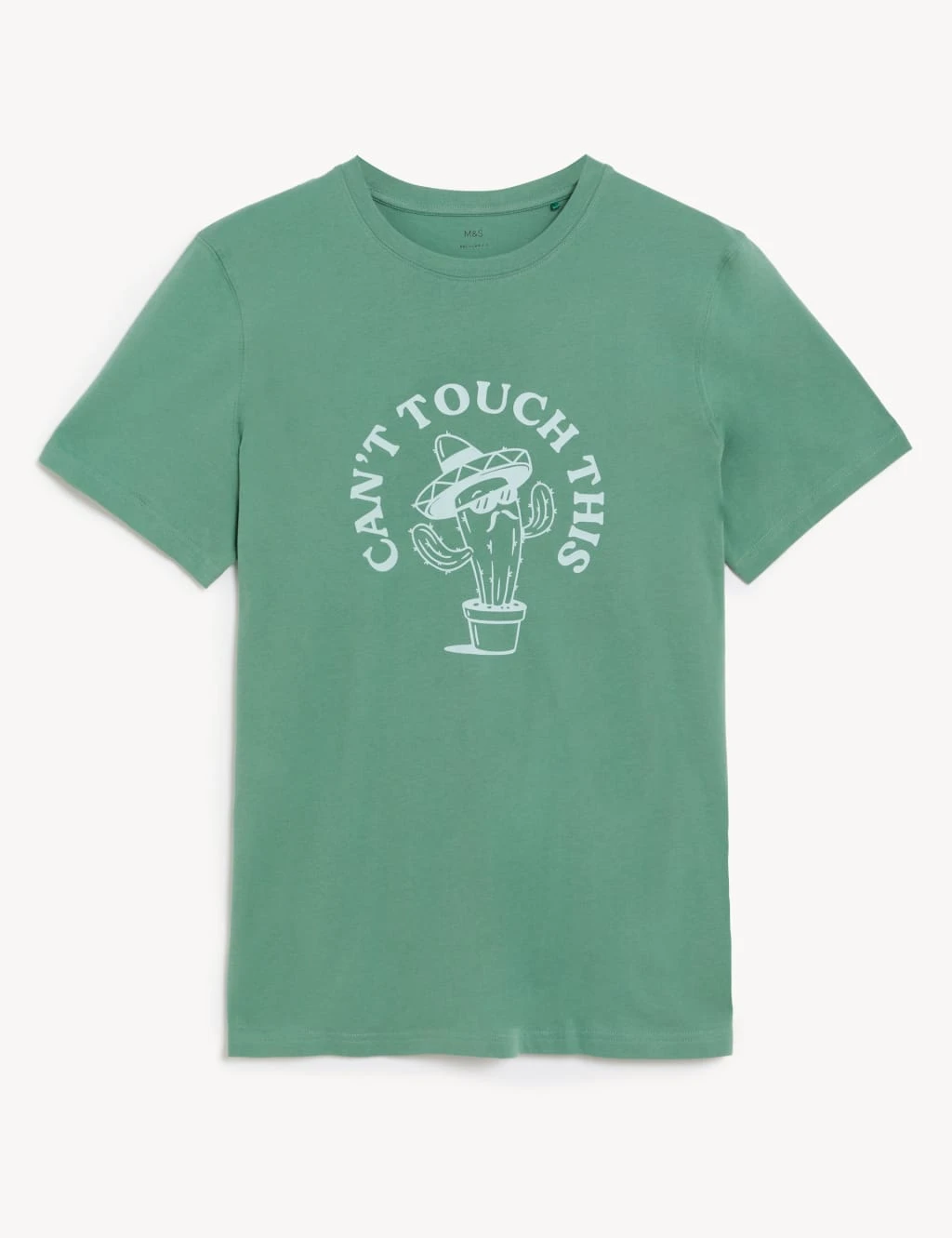 Look sharp in this fun cactus print t-shirt, made from pure cotton. Comfy regular fit. Print features a tough cactus character in shades and a sombrero, with the cheeky slogan ‘Can’t touch this.’ A coordinating Mini Me version is available in our kidswear collection. M&S Collection: easy-to-wear wardrobe staples that combine classic and contemporary styles.