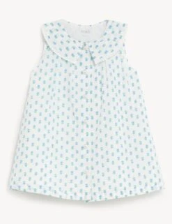 Get them ready for a special occasion with this sweet pure cotton floral dress. The sleeveless design has a lace-trimmed collar and a smock-like shape with a full skirt. It fastens through the front with a row of pretty pearly buttons. A lining provides extra comfort.