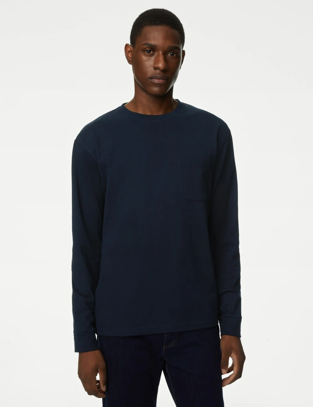 This essential long-sleeved t-shirt is perfect for everyday wear. Crafted in pure, heavyweight cotton for comfortable wear, this relaxed-fit style features a ribbed round neck and cuffs, plus a patch pocket on the chest for detailing. We only ever use responsibly sourced cotton for our clothes.