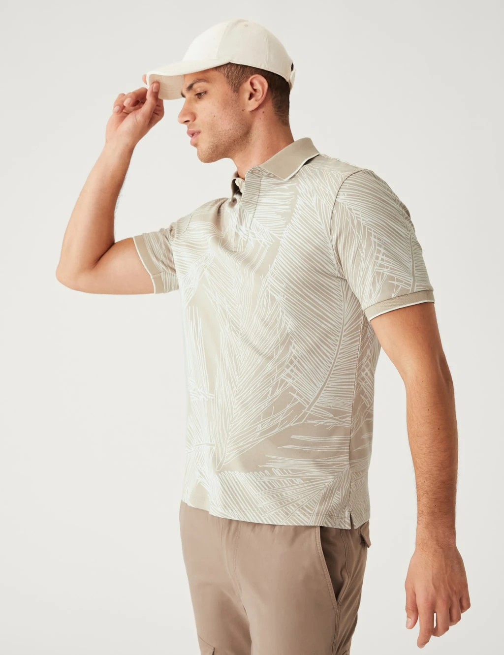 Bring a summery look to your casual outfits with this pure cotton leaf print polo shirt. Made to a comfortable regular fit. Tipping at the collar and cuffs adds a smart touch.