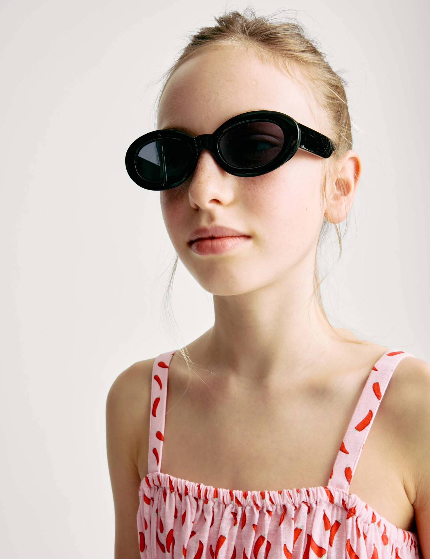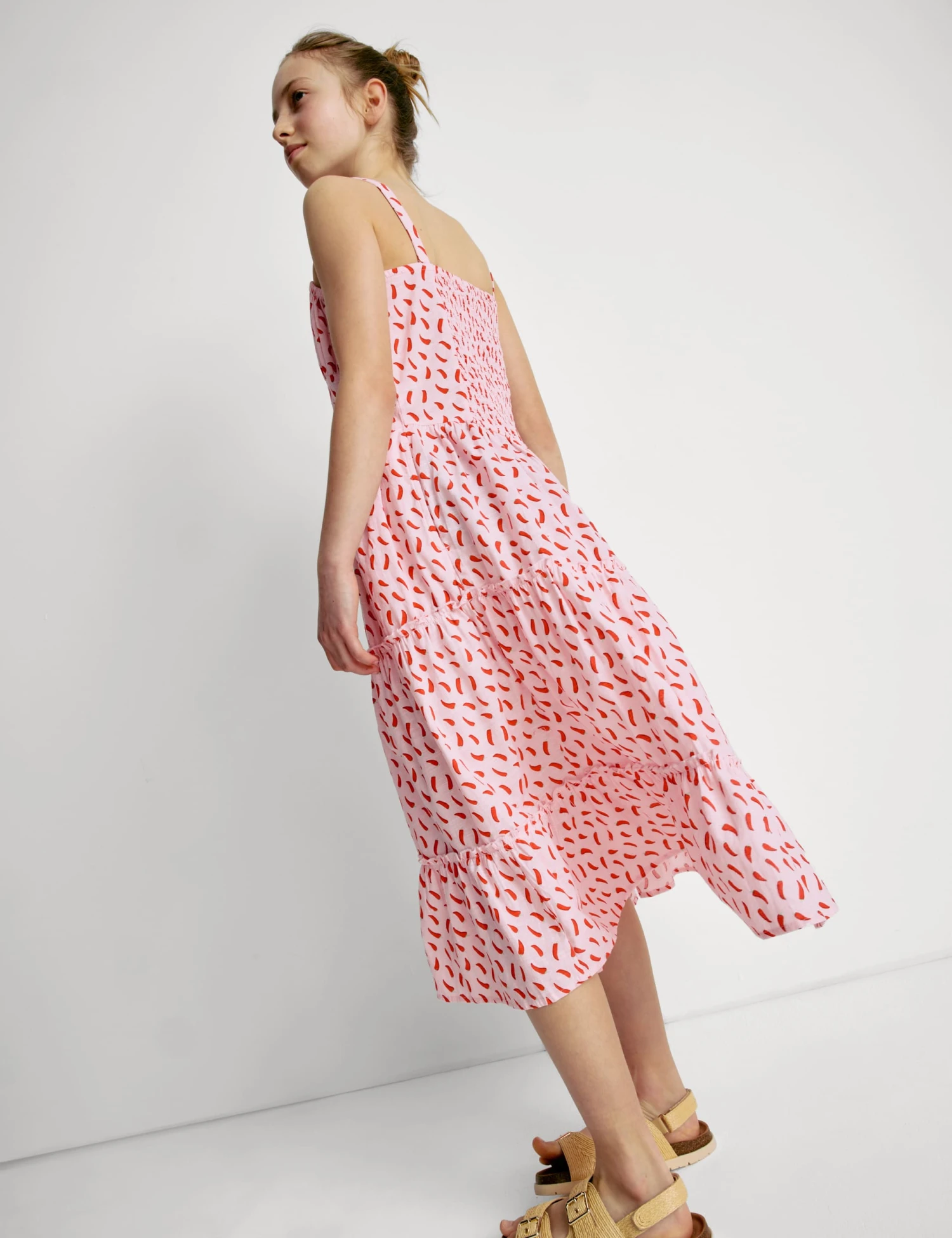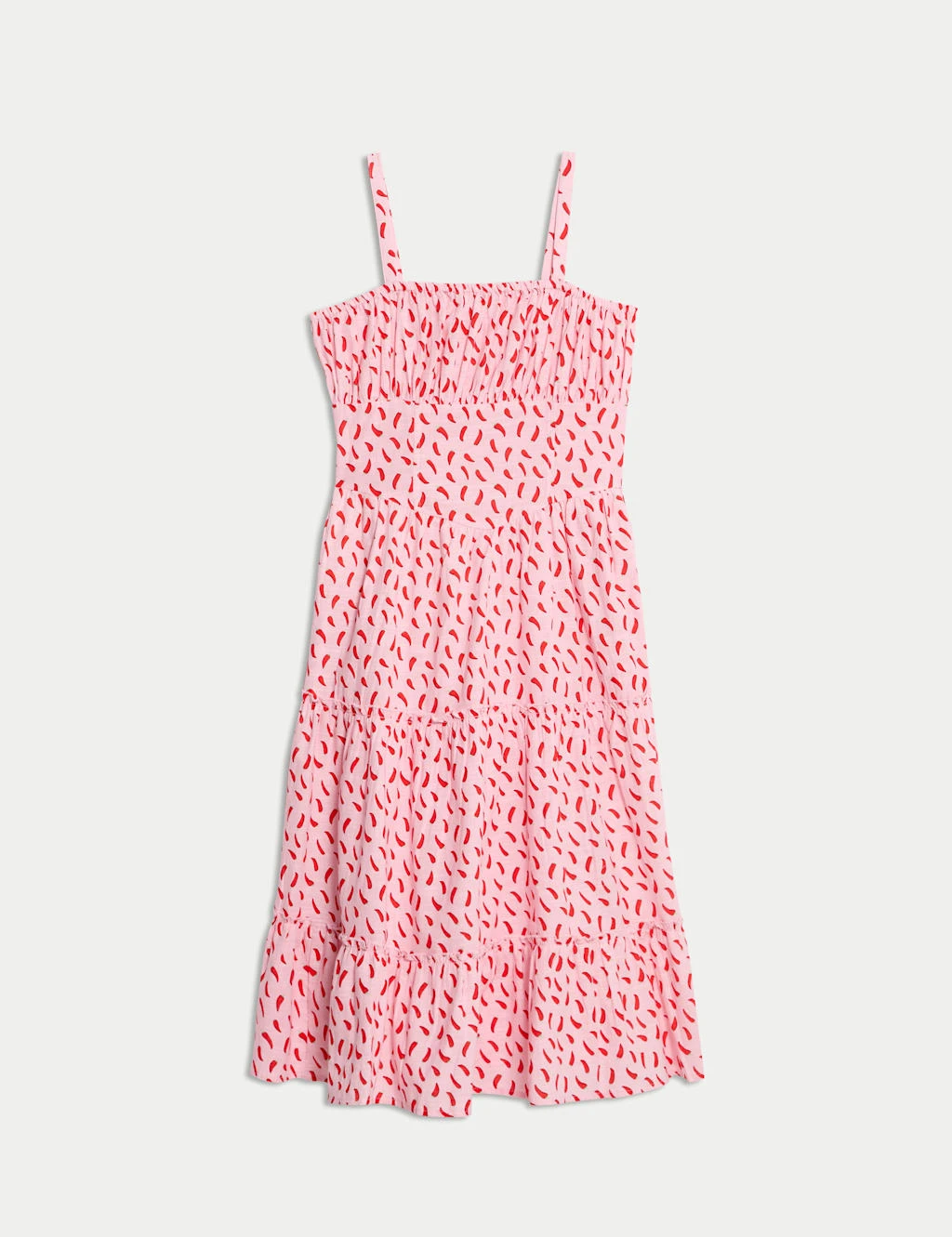Spice up their wardrobe with this pure cotton maxi dress. It’s designed in a fitted shape, with a shirred bodice for comfort. All-over chilli print gives it a fun The sleeveless style and square neckline bring a breezy feel, while a frilled hem adds a playful finish.