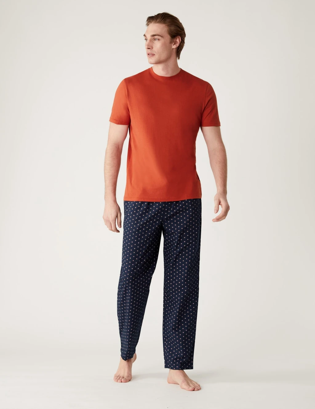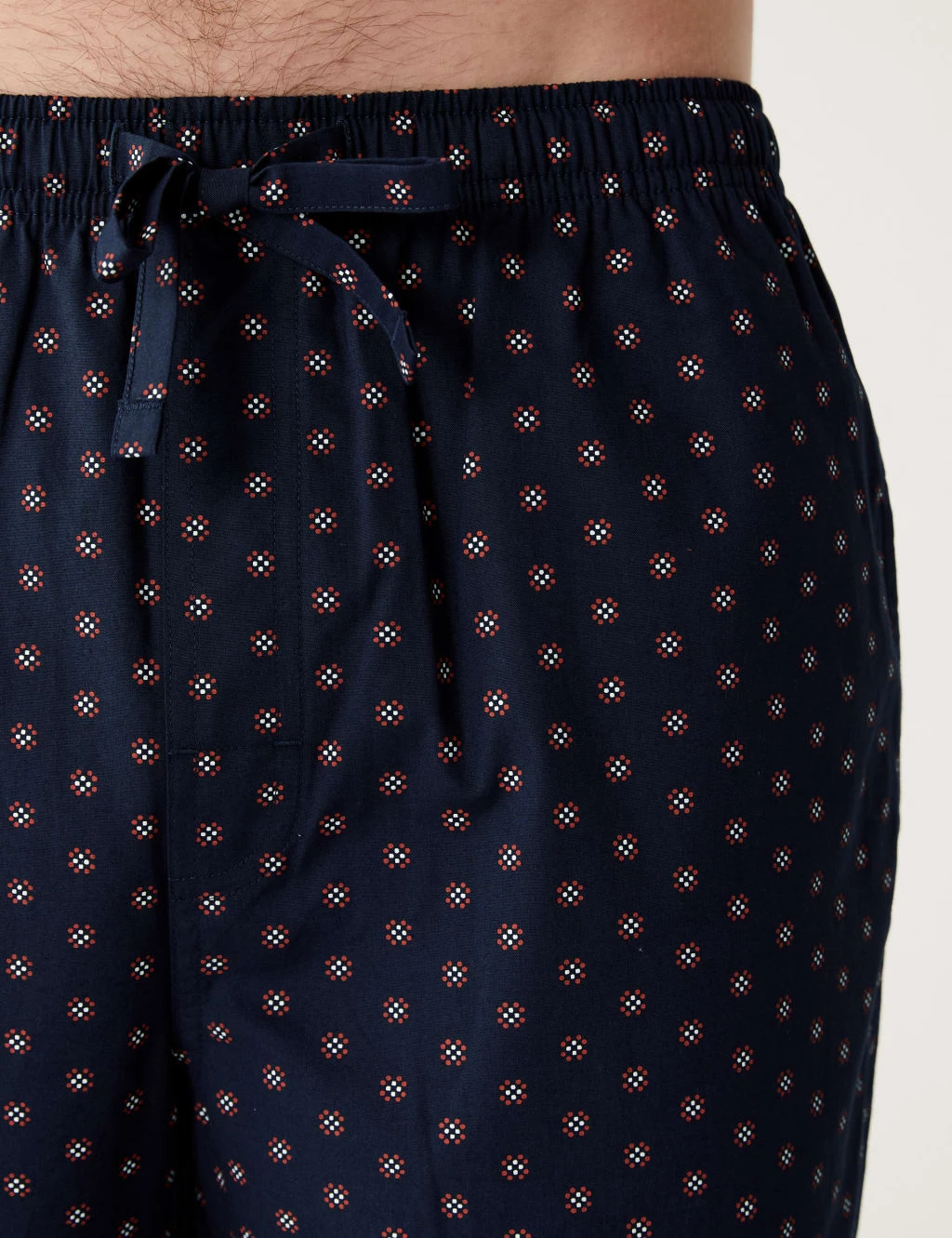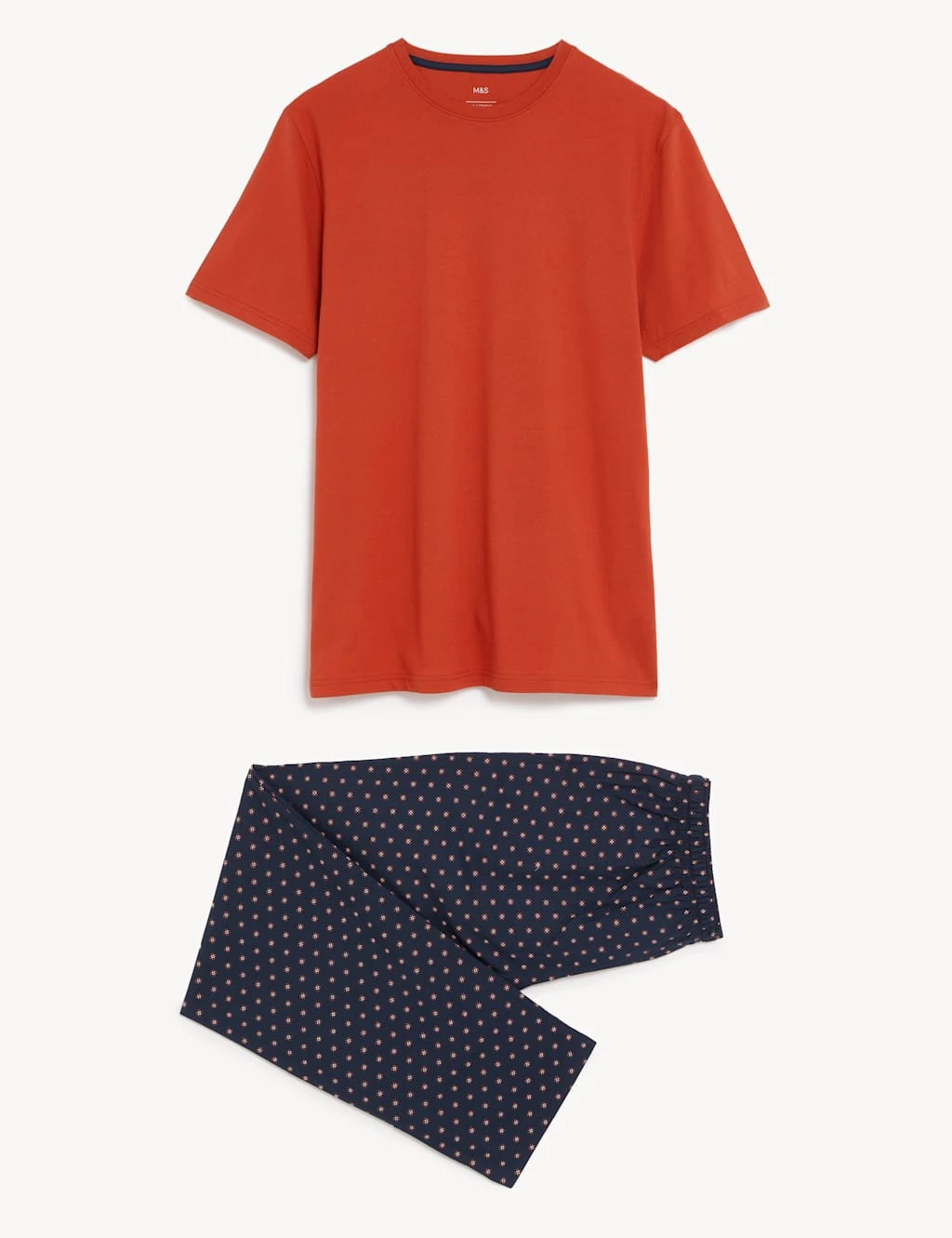 Enjoy the pure cotton comfort of these pyjamas. The set comprises a breezy short-sleeved top and long printed bottoms, both in an easy regular fit. An elasticated drawstring ensures a stretchy feel around the waist. The bottoms are complete with a mock fly and handy side pockets.