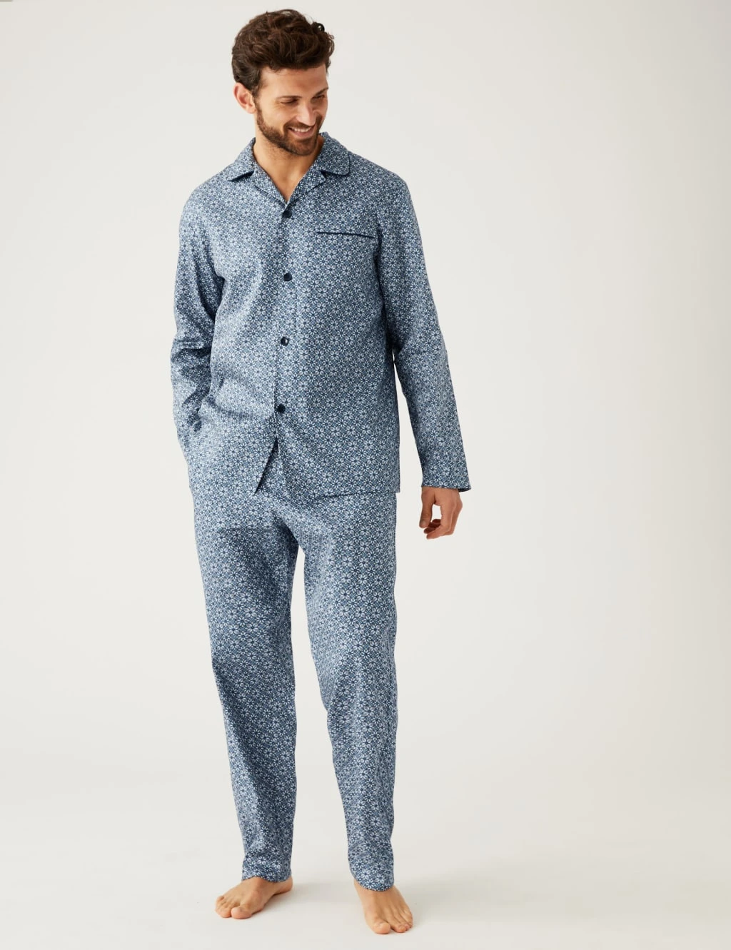 With its funky mosaic print, this pure cotton pyjama set brings an eye-catching take to a classic design. Comfy regular fit. The button-through top features piping on the chest pocket and collar for a stylish touch. The bottoms have an elasticated waist for comfort, with a functional button fly and side pockets.