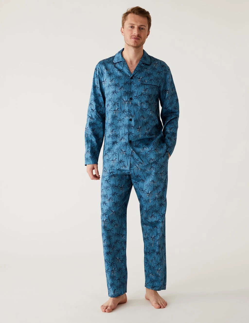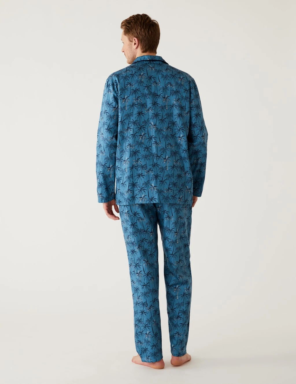 Bring a touch of the tropics to bedtime with this pure cotton palm print pyjama set. Made to a comfy regular fit. Bottoms have an elasticated waist for easy wearing, a secure two-button fly closure and practical side and back pockets. Button-fastening top features stylish tipping at the collar and chest pocket.