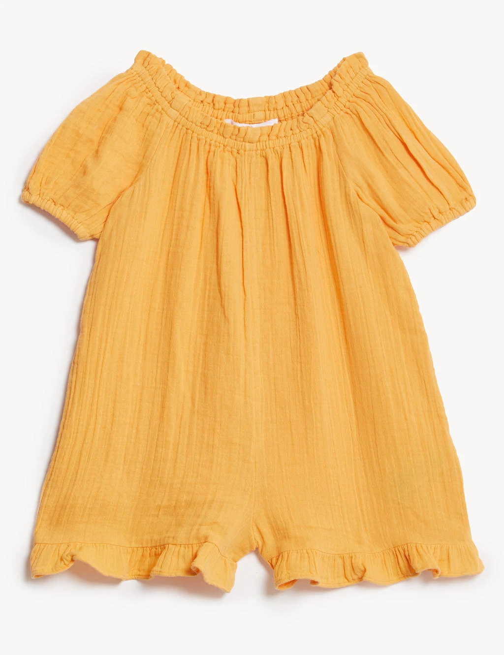Kids can frolic all day long in this cute cotton playsuit. Comfy regular fit, with short, gently puffed sleeves. Ruffles at the round neck and frills on the legs make it extra pretty.