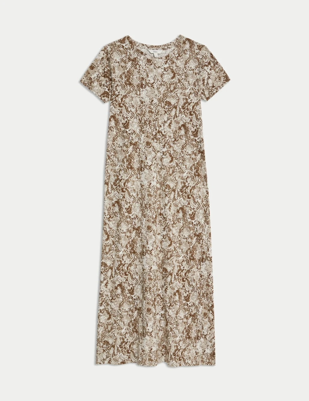 Embrace effortless style with this t-shirt dress crafted from pure cotton for a breathable feel. Designed in a relaxed fit with a midi-length skirt, it’s an easy throw-on piece for effortless dressing. The round neckline, short sleeves and bold all-over animal print add a playful touch to its laid-back charm. M&S Collection: easy-to-wear wardrobe staples that combine classic and contemporary styles.