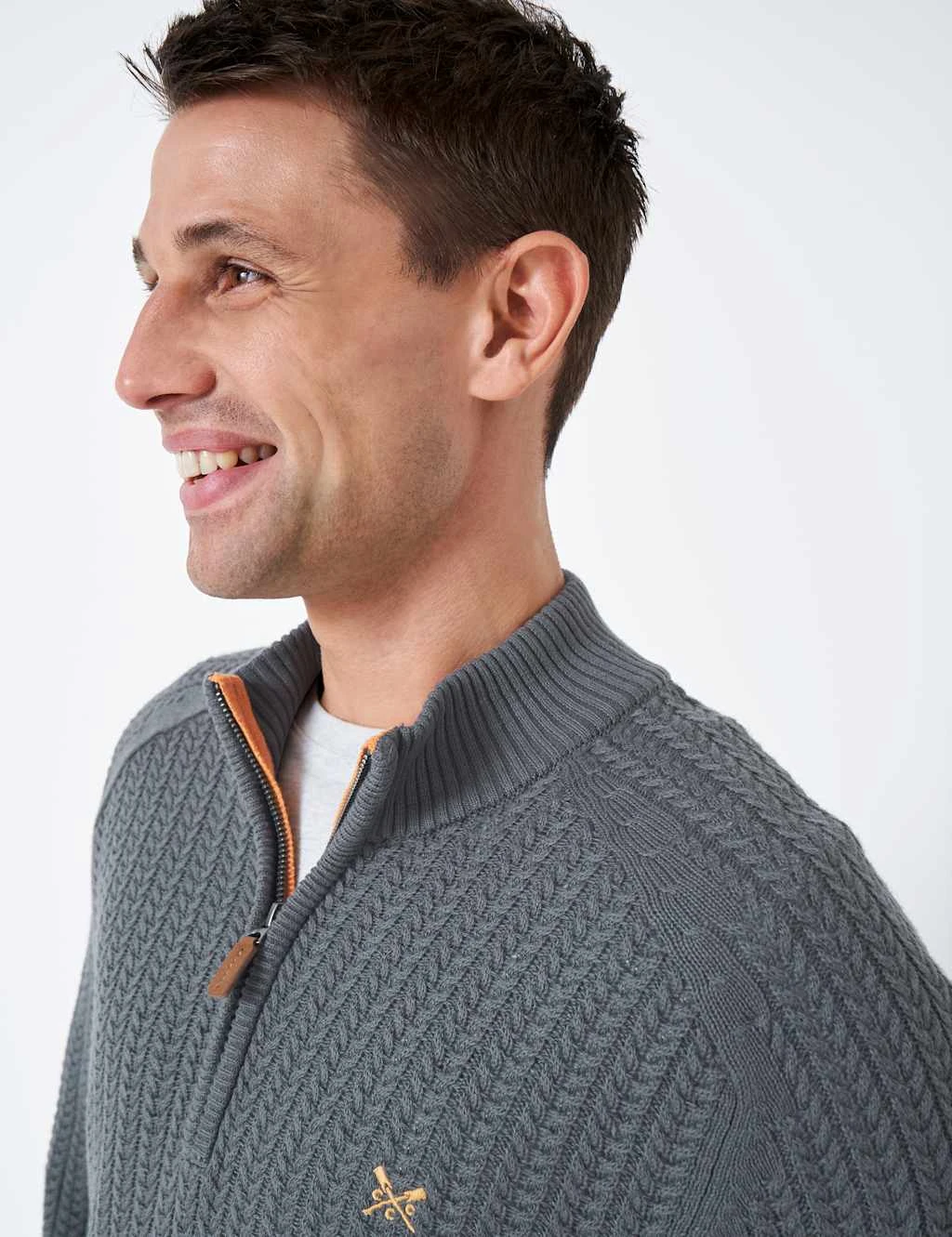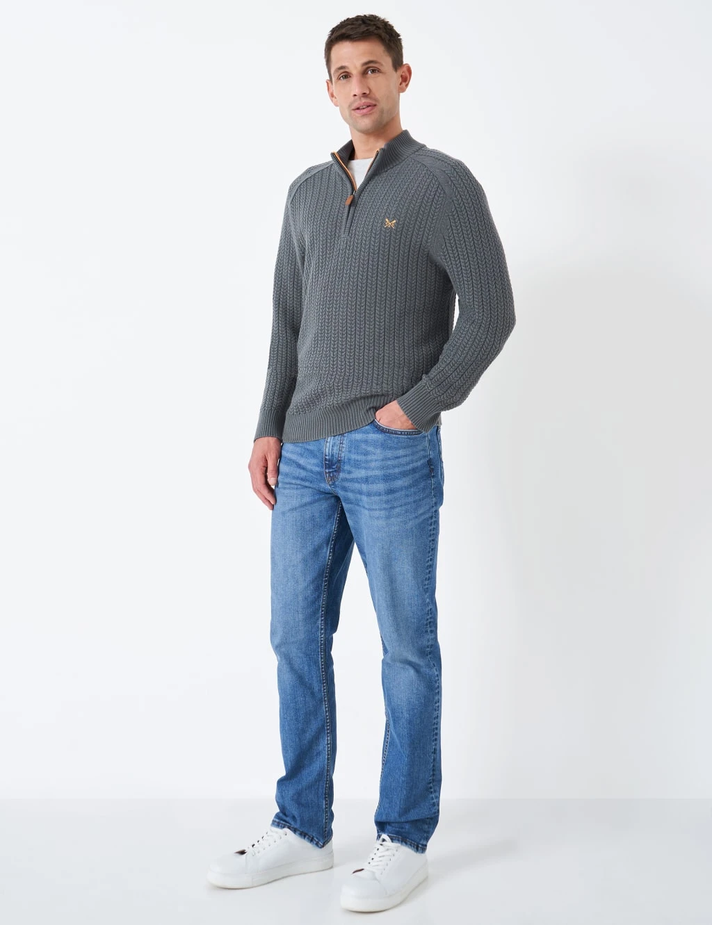 Layer up on cooler days in this pure cotton jumper from Crew Clothing. It’s knitted in a herringbone pattern that creates plenty of textural interest and has a half zip fastening at the collared neck for extra warmth. An embroidered logo on the chest adds a subtle touch of branding, while ribbed trims at the waistband and cuffs complete the look.