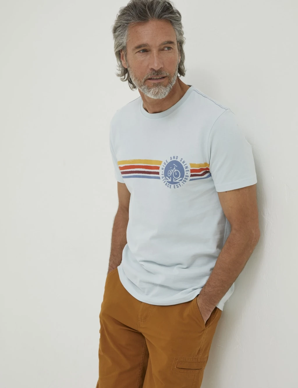 Make an early start in style with this pure cotton t-shirt from FatFace. It’s made to a comfortable regular fit, with a classic crew neck. Perfect for cycling enthusiasts, the print features stripes across the chest with a ‘Ride and Shine’ slogan circling a bike graphic.