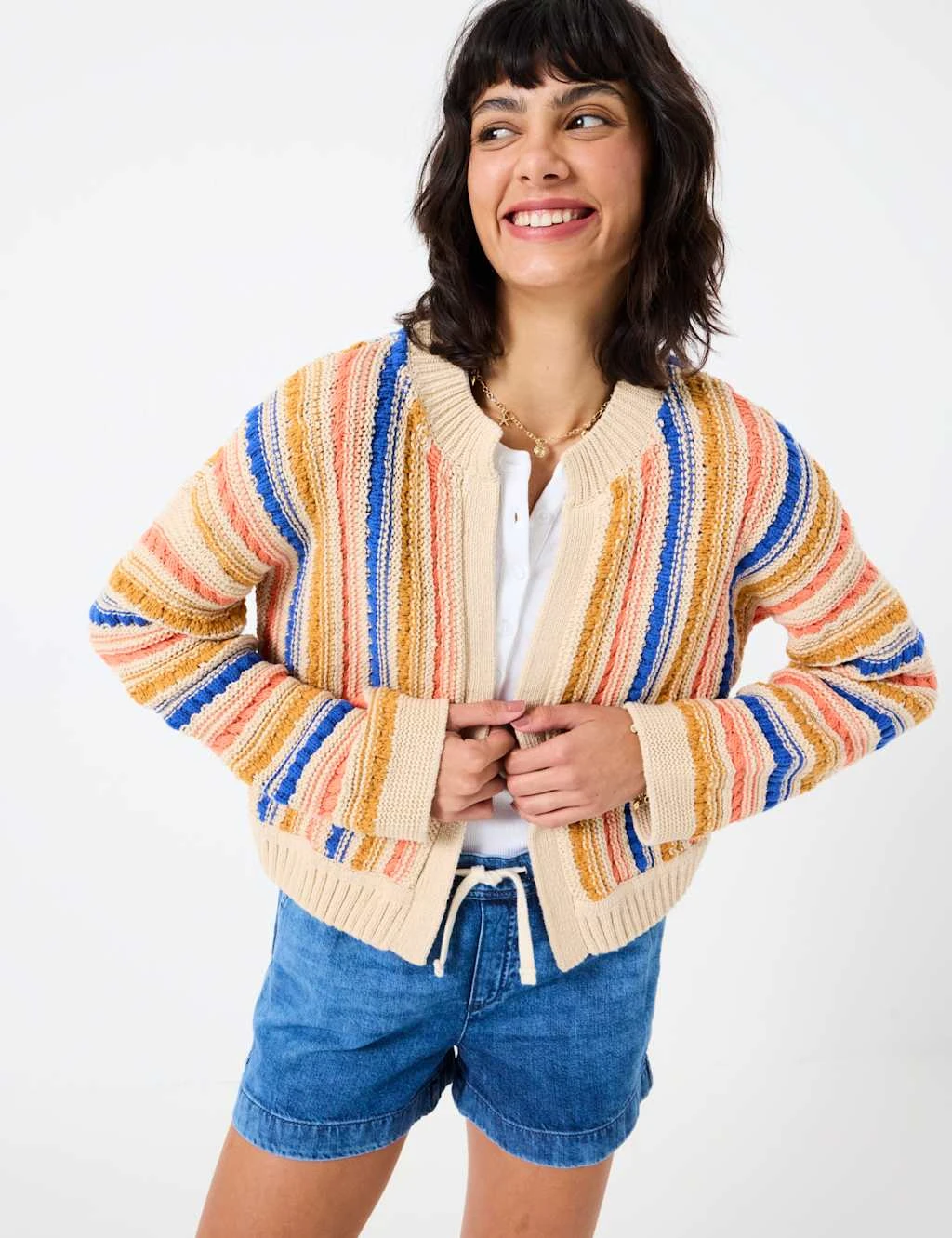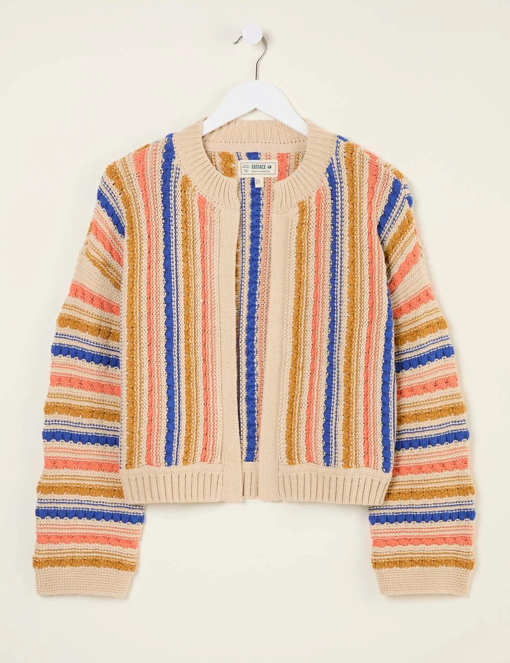 This pure cotton cardigan from FatFace is the perfect layer for summer evenings. It’s knitted in a regular fit, with an open front and a timeless crew neckline. The ribbed collar, cuffs and hem provide a neat finish, while the bold striped design ensures a standout look. Wide sleeves help create a flattering silhouette.