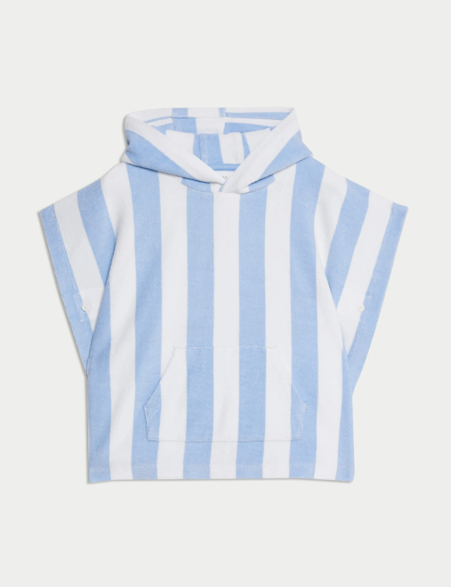 This striped towelling poncho is perfect for keeping them cosy after swimming. The pure-cotton piece is designed with a snuggly hood and features a kangaroo pocket on the front to warm their hands.