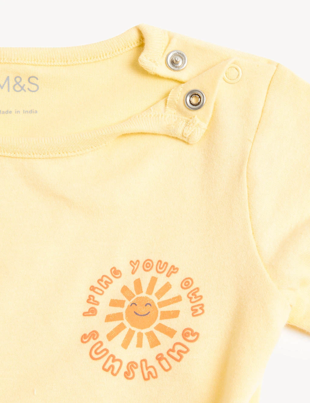 This pure cotton t-shirt is ideal for brightening baby’s dressing routine. Features poppers on the shoulders to help you during changing time. The graphic on the front shows a smiling sun surrounded by a ‘Bring Your Own Sunshine’ slogan.