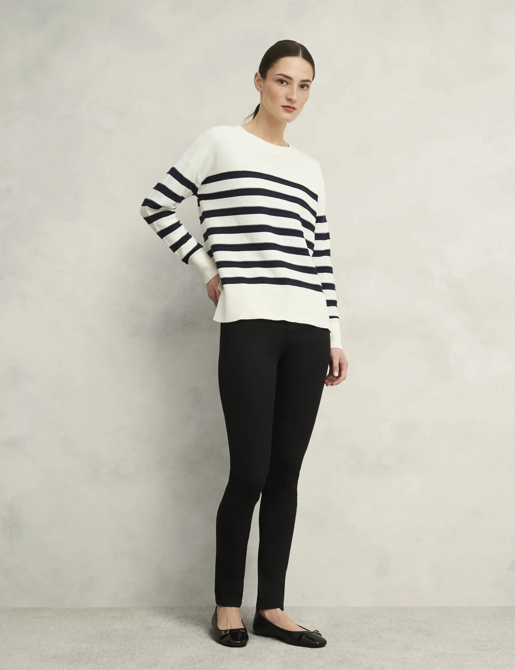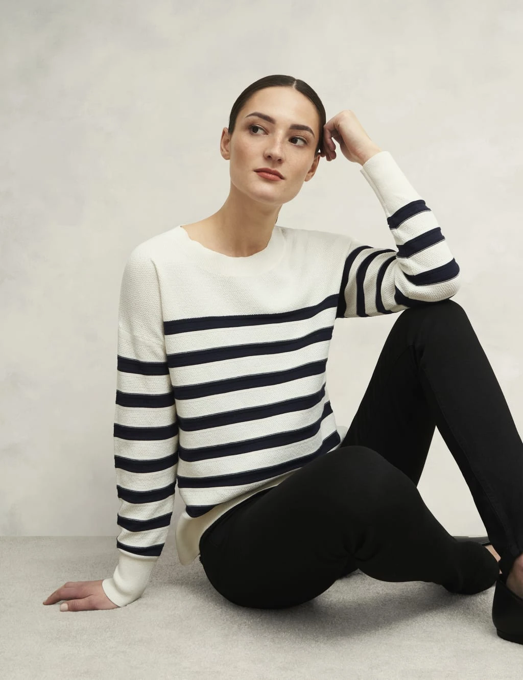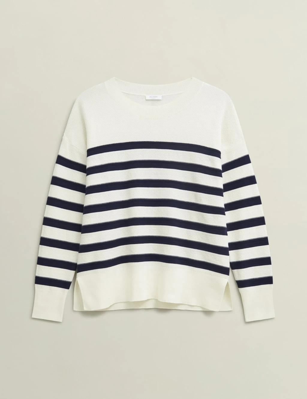Crafted from pure cotton, this women’s Hobbs jumper offers both comfort and breathability in an enduring design. The regular fit and crew neckline create an effortlessly smart silhouette, while the all-over striped pattern features subtle texture for added visual interest. Casual dropped shoulders and long sleeves ensure everyday wearability, making this sweater perfect for any occasion, complemented by a split hem that makes layering a breeze.