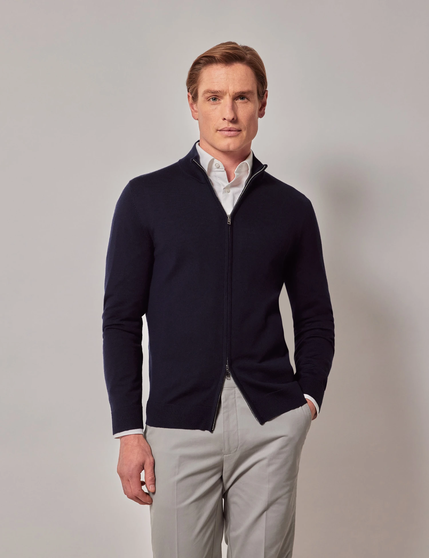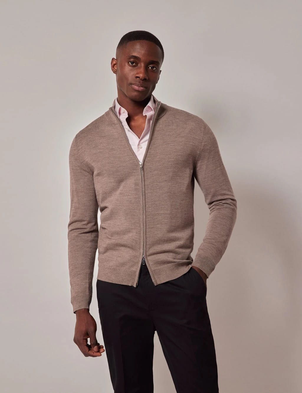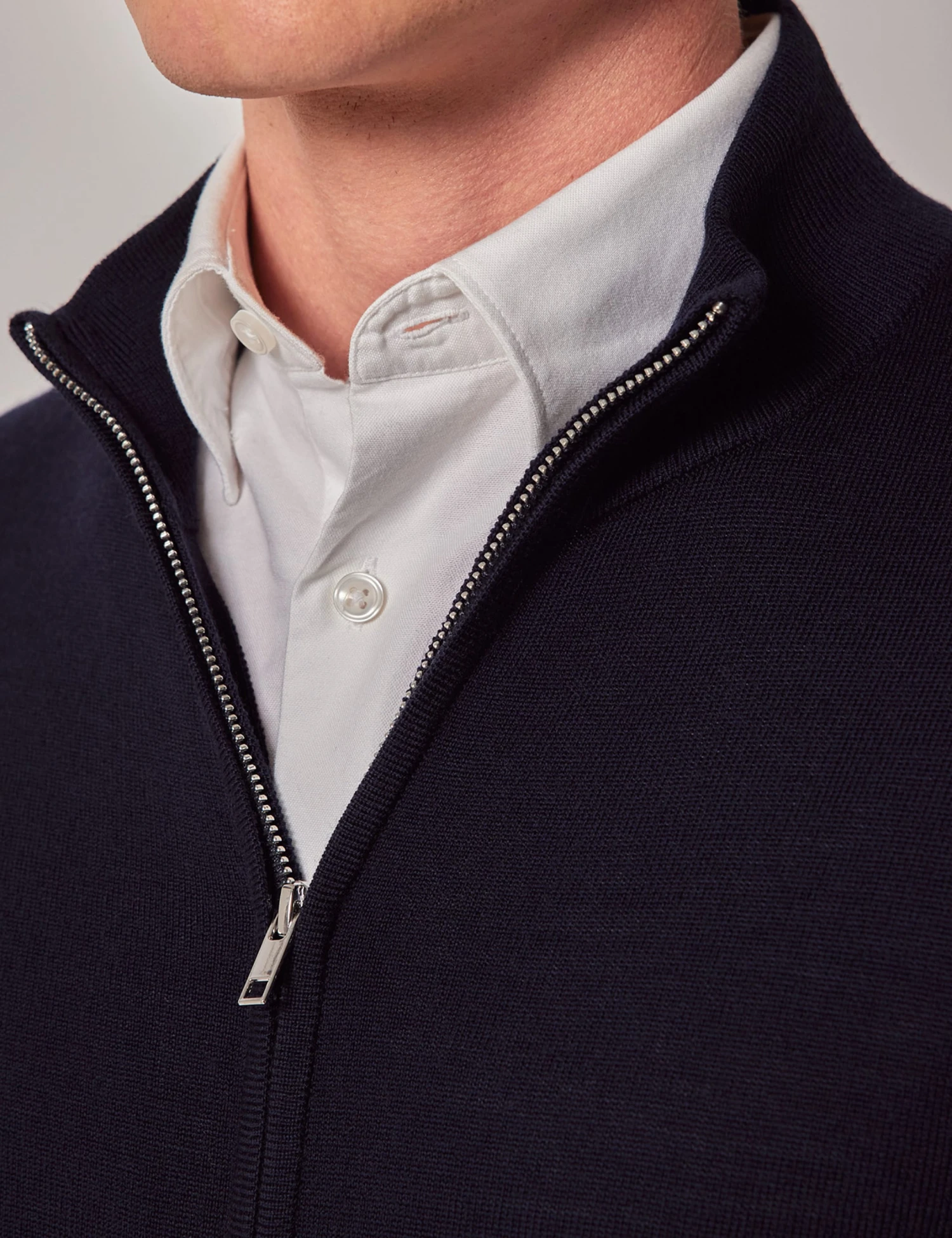 This Hawes & Curtis jumper is crafted from pure merino wool, offering luxurious softness. It has a smart higher neckline with a two-way zip fastening that lets you wear it your way. Ribbed trims at the cuffs and waistband add a neat finish.