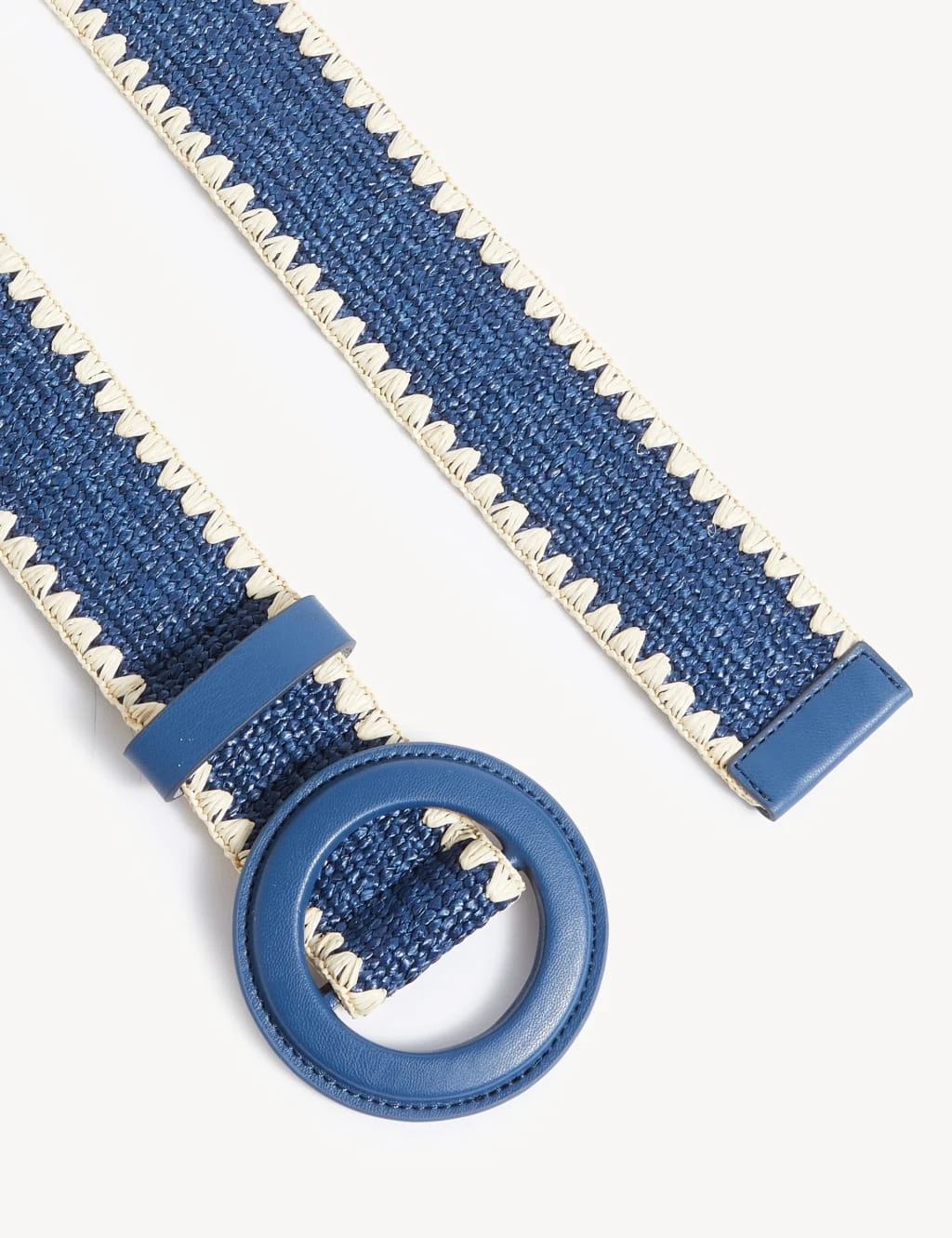 Accessorise your trousers in style with this retro-style raffia belt. It can be adjusted using the circular buckle and held in place with the matching loop. The strap itself has a woven texture, with contrasting stitched edges.