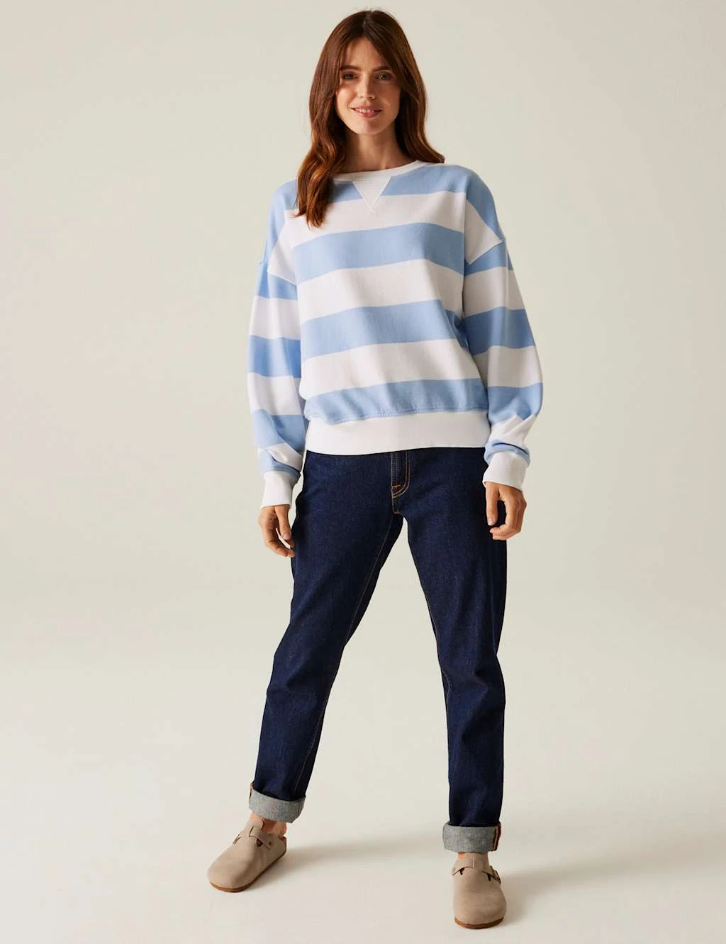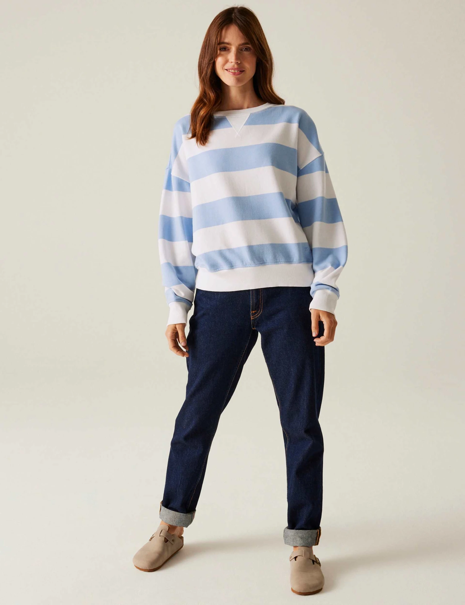 With its laidback dropped-shoulder silhouette, this cotton-rich jumper from Regatta is a casualwear staple. It’s made in a regular fit from soft garment-washed fabric, with a sporty inserted v-detail at the crew neckline. This piece features bold stripes and subtle branding towards the hem. It’s finished with stretchy ribbed trims.