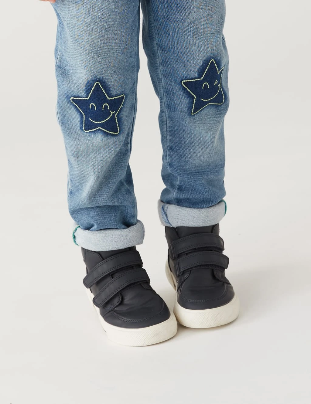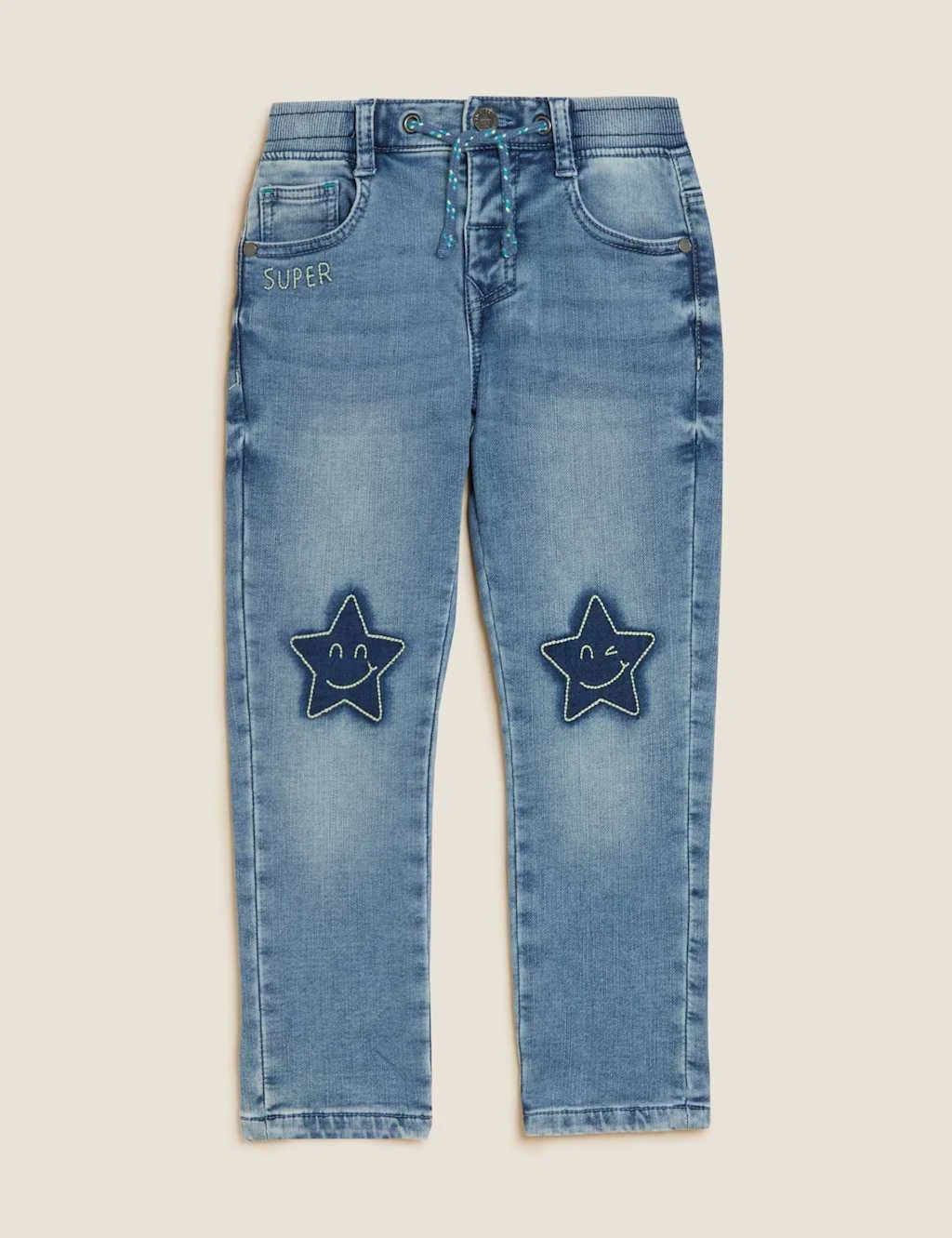Your little trendsetter will love these quirky cotton-rich jeans. Comfy regular fit with an elasticated drawstring waist to keep them secure. The pocket features the word ‘Super’, and embroidered smiling stars at the knees give a fun finish. All M&S denim is made with responsibly sourced cotton and less water.