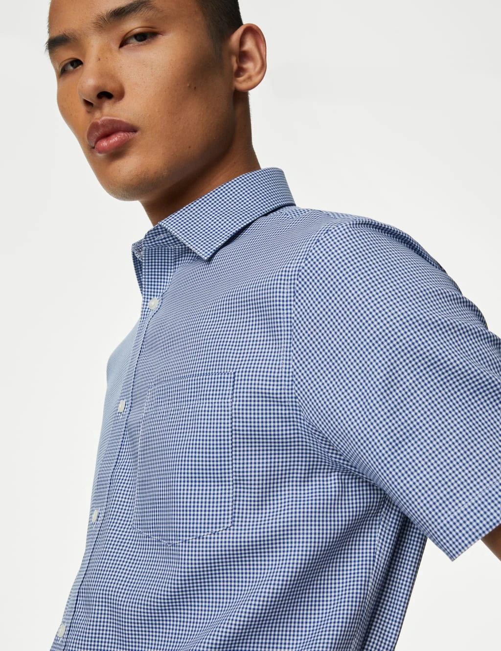 Bring a summery feel to your smart looks with this pure cotton gingham shirt. The short-sleeved style has a regular fit, with a classic collar neckline. Our non-iron finish means you won’t have to worry about creases, even after washing and tumble drying. We only ever use responsibly sourced cotton for our clothes.