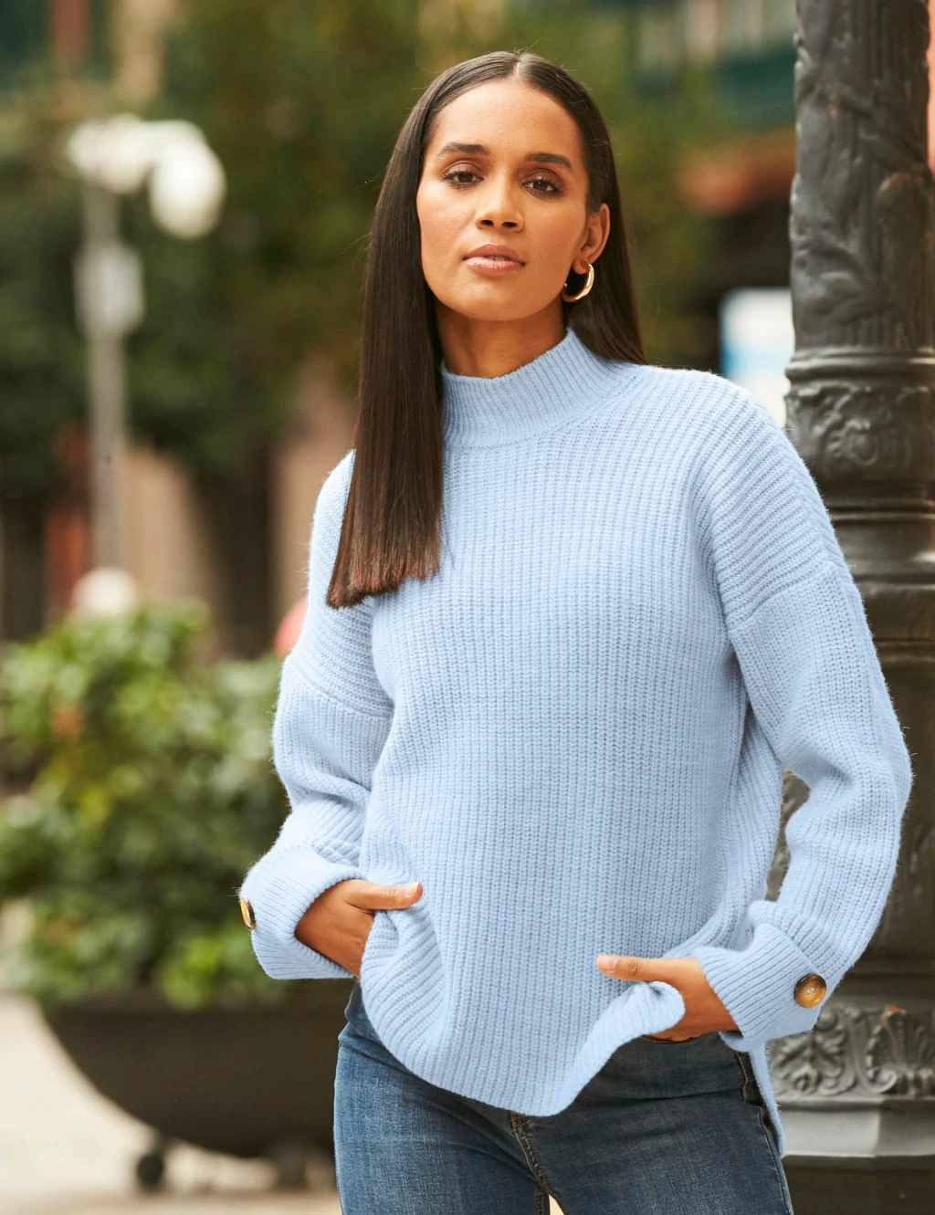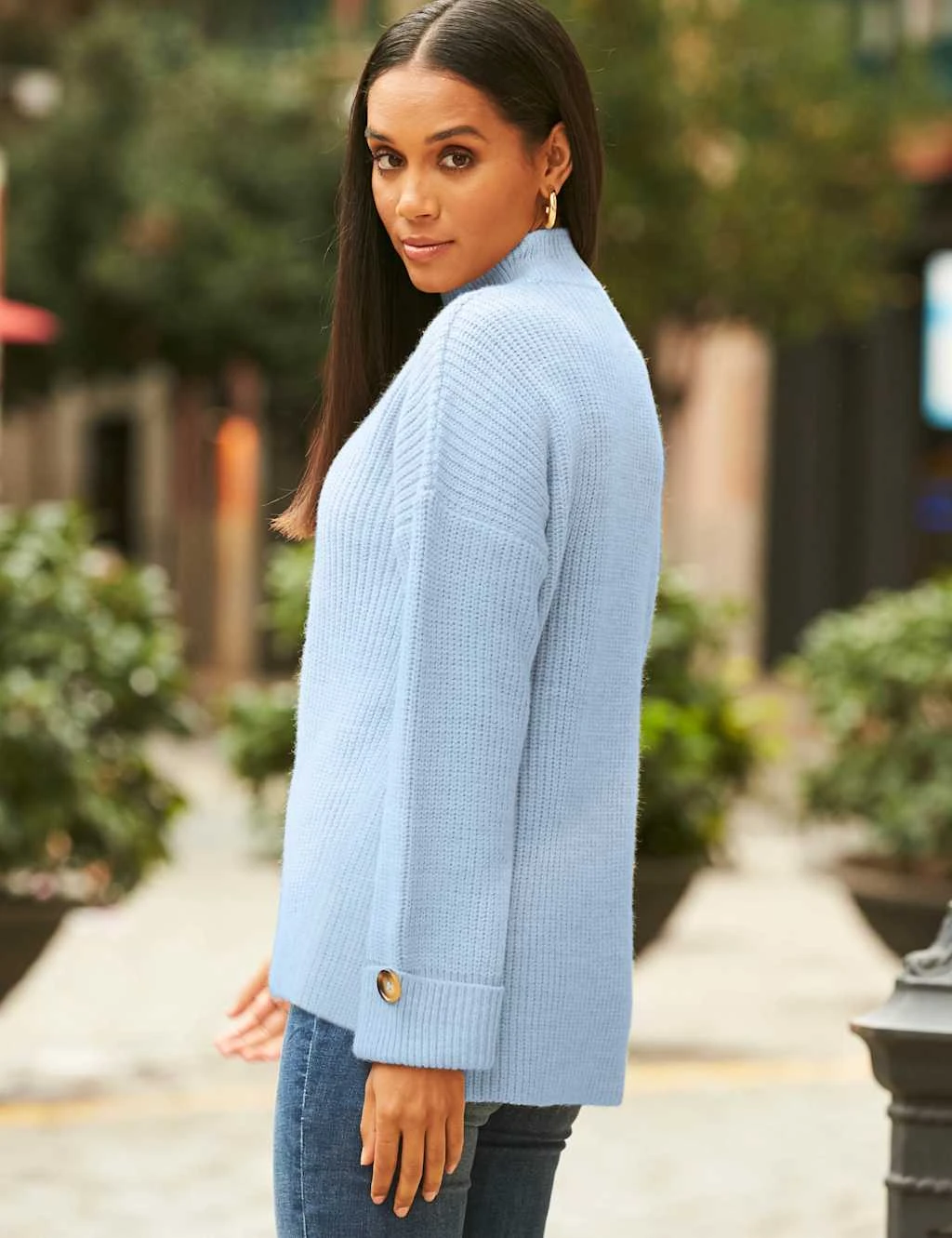 This versatile jumper from Sosandar brings extra flair to your knitwear collection. It’s made in a comfy regular fit, with a high neckline that shuts out chilly draughts. All-over ribbing adds texture and the long sleeves have striking fold-over cuffs. Tortoiseshell buttons give a traditional touch while the dipped hem is split at the sides for easy movement.