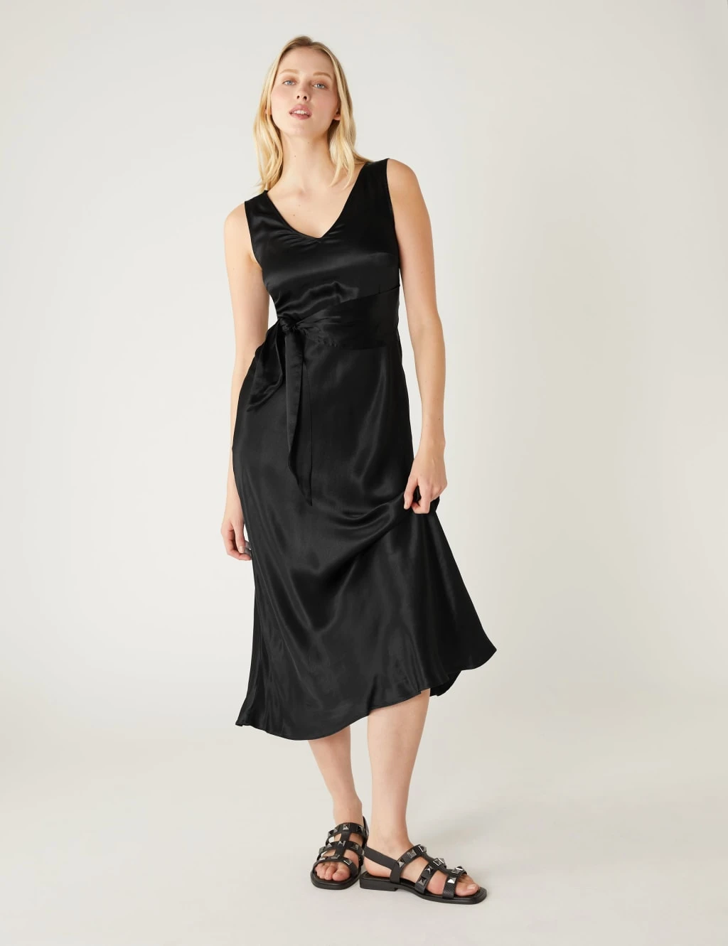 An elegant look is effortless with this satin dress. The sleeveless design is cut to a regular fit with a v-neckline for a feminine feel. A tie front fastening creates a waisted silhouette, while the midi-length hem ensures a flattering finish.
