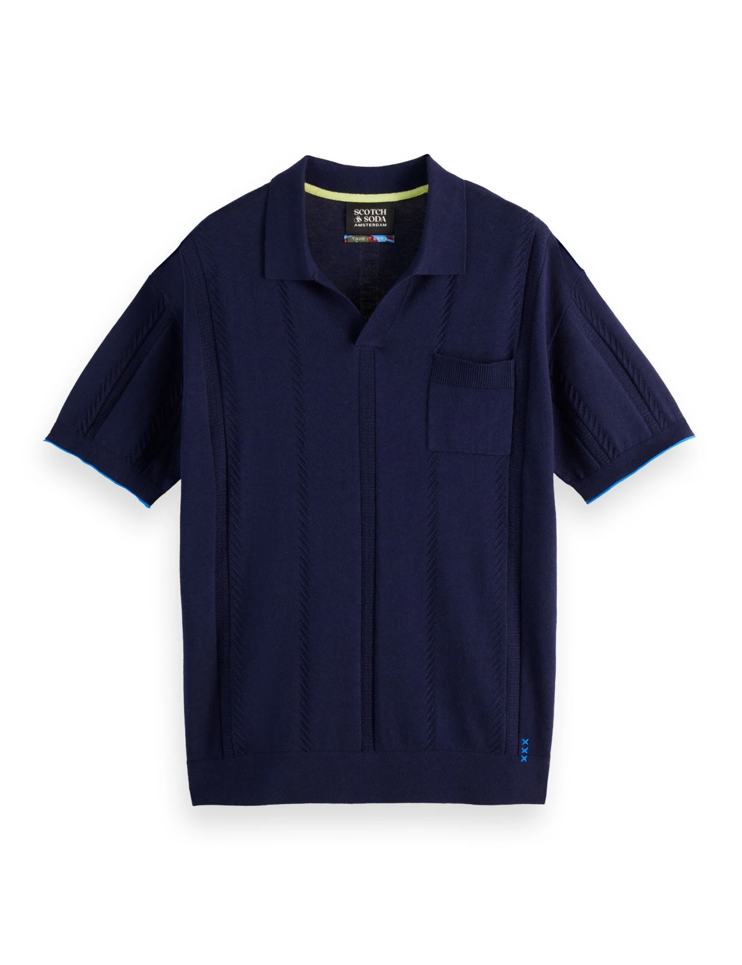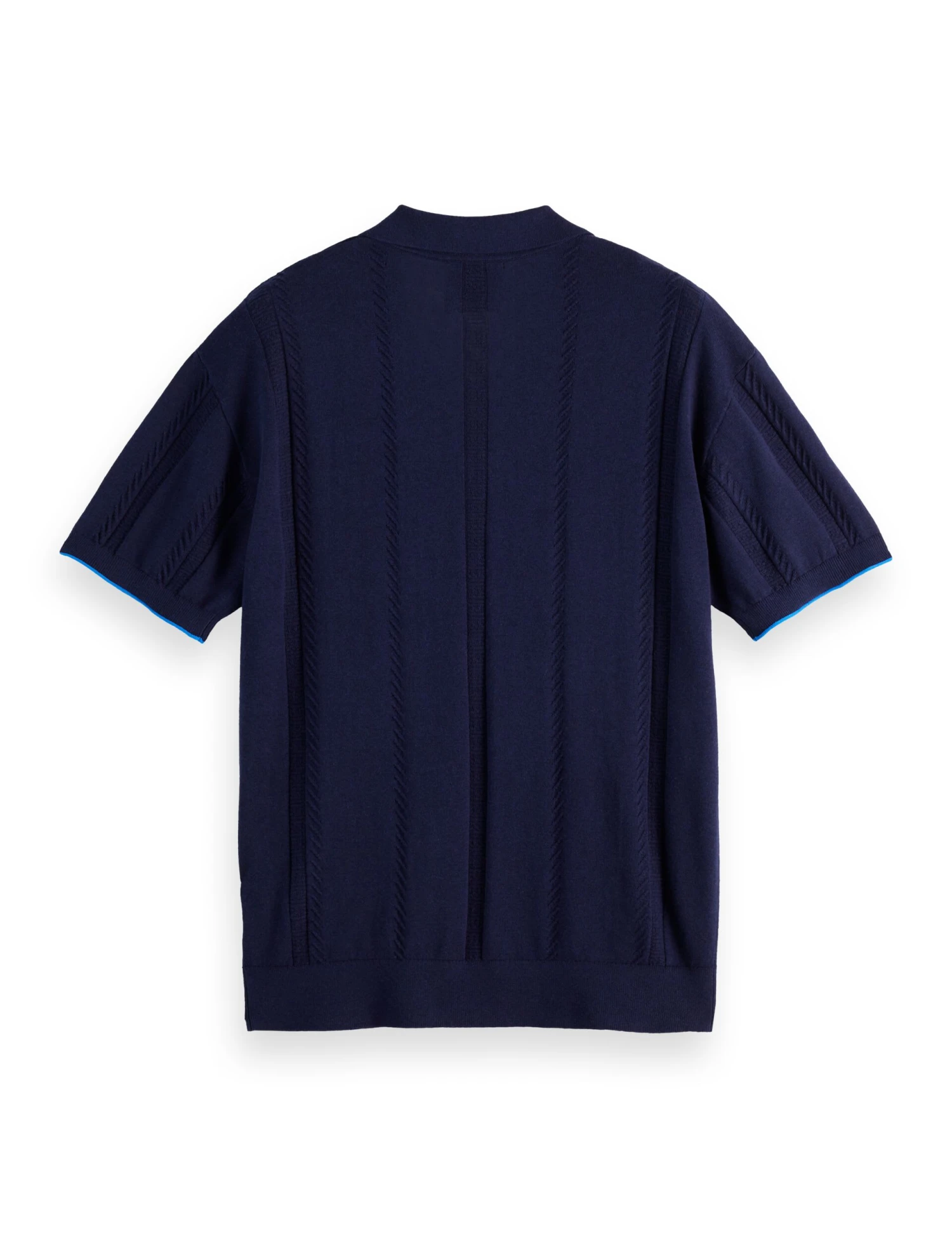 With its rib knit and vertical stripes of textured tonal stitching, this polo shirt from Scotch & Soda exudes casual cool. It’s made in a relaxed fit and knitted from breathable cotton-blend yarn with a touch of linen. A v-neck and open, buttonless soft collar add to the laid-back vibe. Contrast tipping on the cuffs of the short sleeves completes the look.