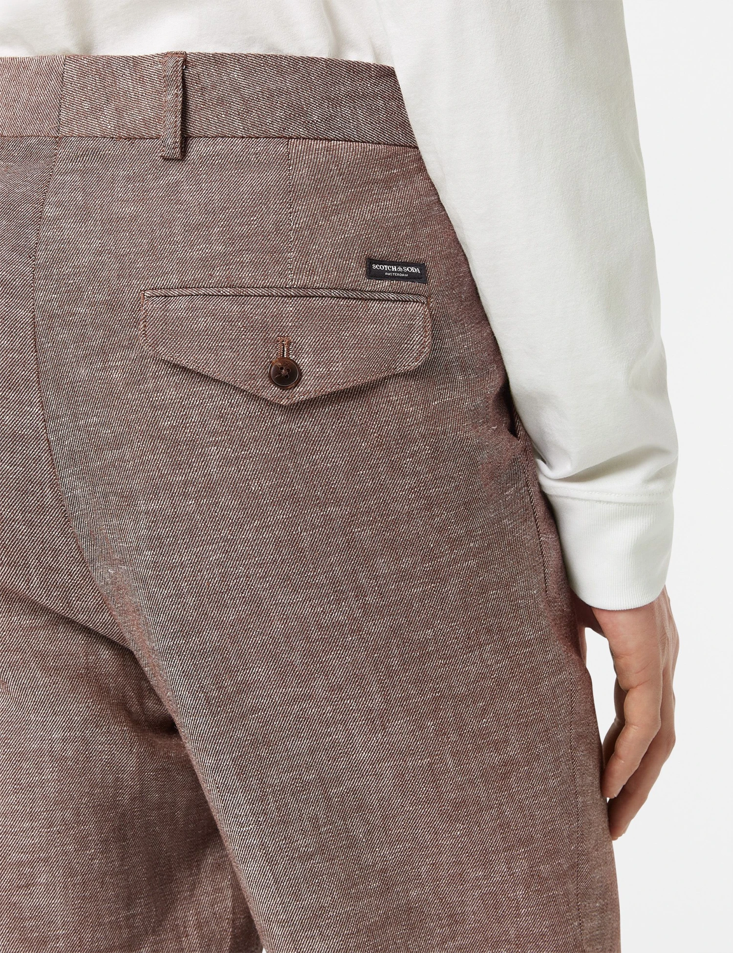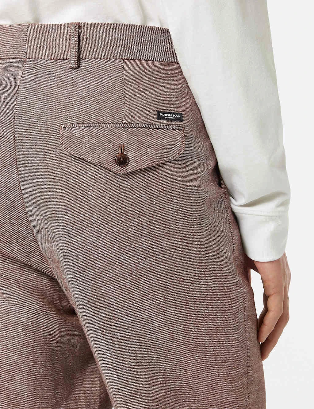 Upgrade your warm-weather staples with these linen-cotton blend twill chinos from Scotch & Soda. Classic regular fit, with a twin pleat front for a tailored look. Complete with side and back pockets, plus a neat button and zip fastening.