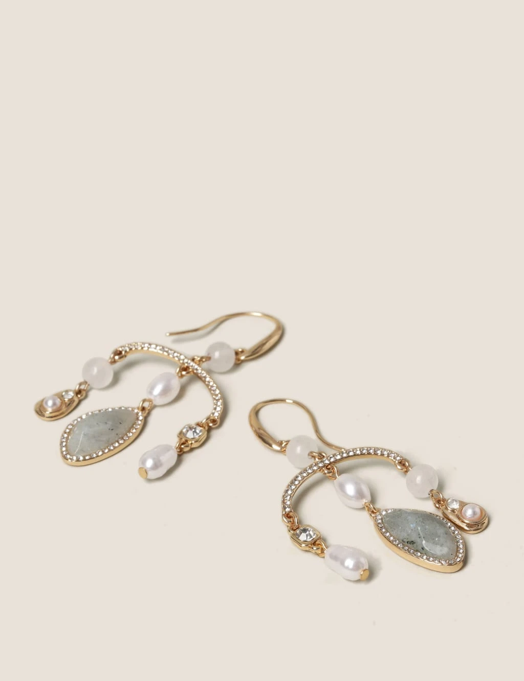 These gold tone Earrings sit in a Mobile style Frame with 3 motifs. The Centre stone is a semi precious stone, that sits in between a single faux pearl and a single white stone