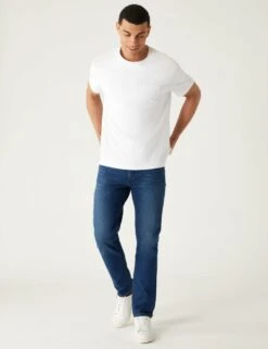These understated jeans are a versatile choice. Made to a stylish slim fit. with added stretch to help them move comfortably with you. Classic five-pocket design with rivets. The buckled belt and button-and-zip fastening ensure they stay securely in place.