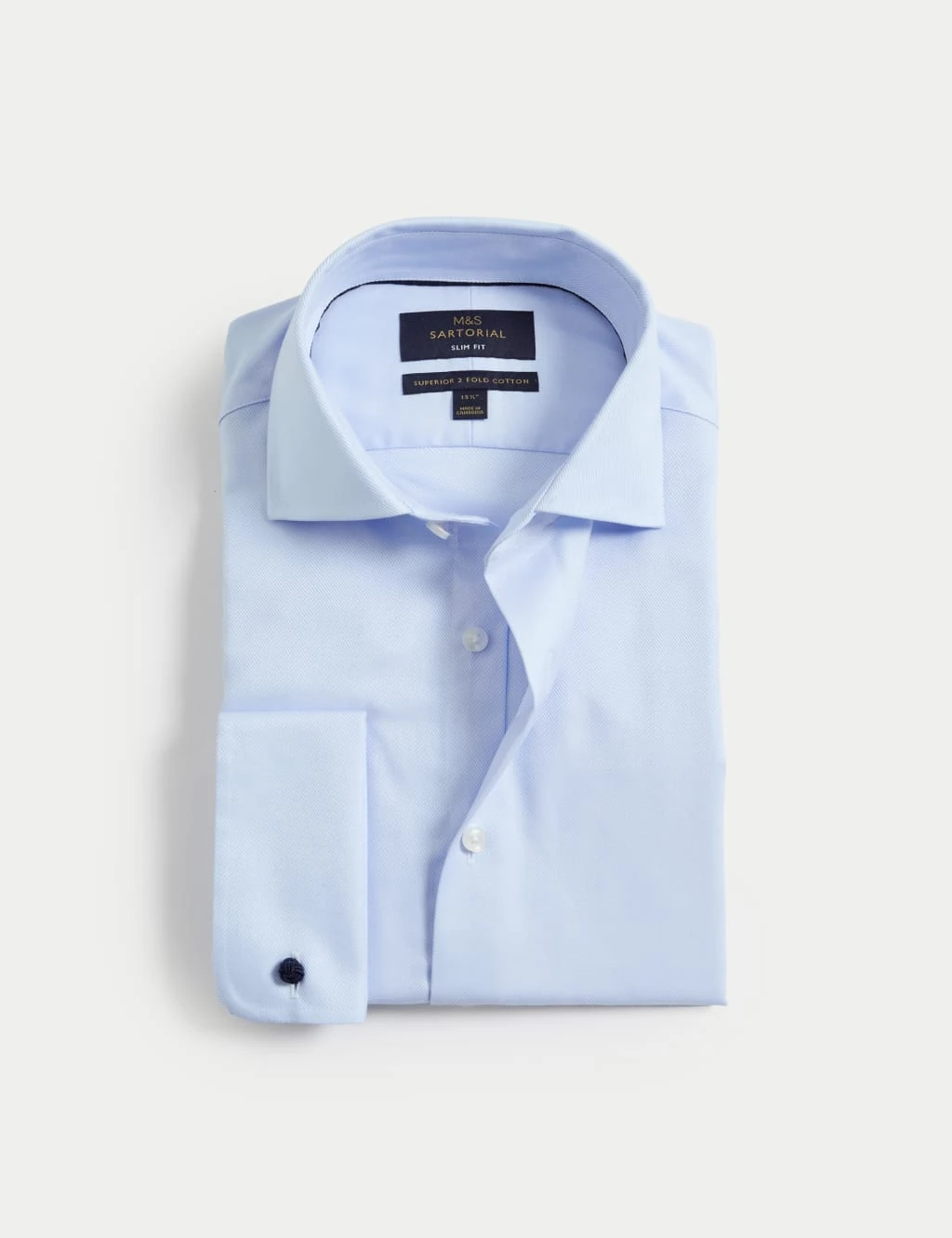 This premium cotton twill dress shirt from our luxury M&S Sartorial collection adds a smart touch to your wardrobe. Made from pure cotton with a subtle weave texture for a premium look. The slim fit gives a modern, tailored look, while the cut-away collar and double cuffs add smart styling touches. Features a button-through front and split back for comfort when moving. The easy-iron finish helps keep it looking crisp with less effort.M&S Sartorial: Luxury tailoring inspired by Savile Row; fusing exceptional craftsmanship with superior fabrics.