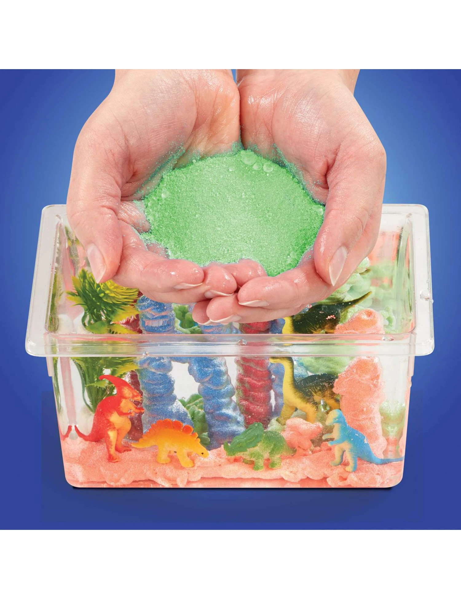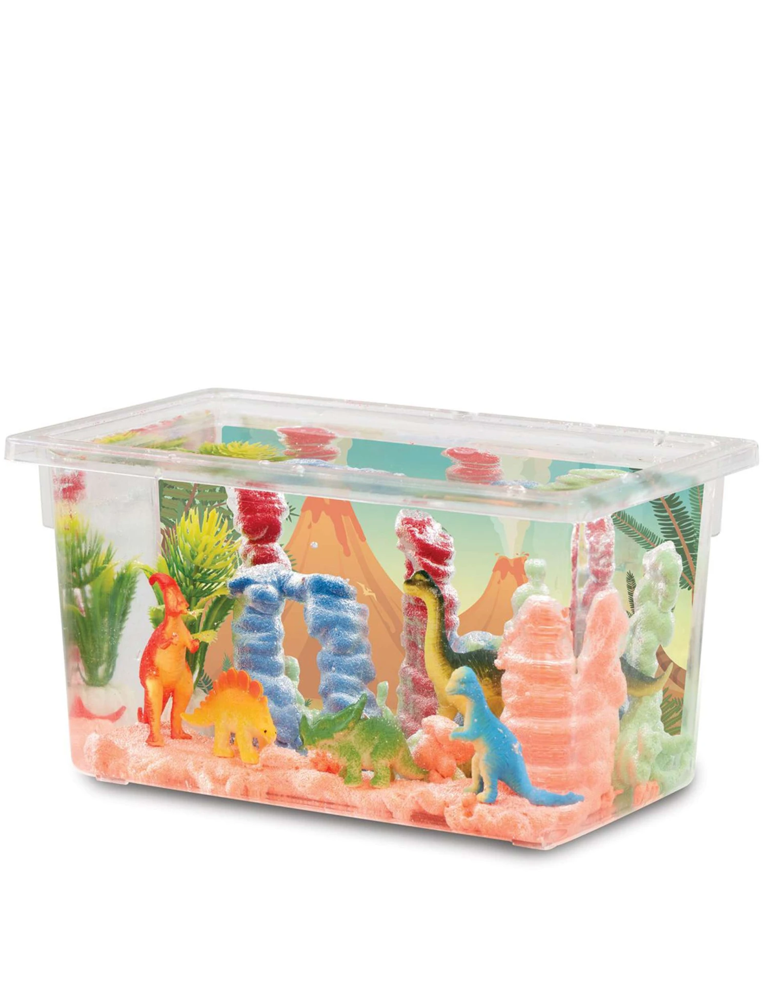Includes: 1x tank, 1x squeezy bottle, 1x multi use tool, 4x 80g sand, 3x dinosaur figurines, 2x baby dinosaur figurines, 1x underwater plant and 1x instruction sheet