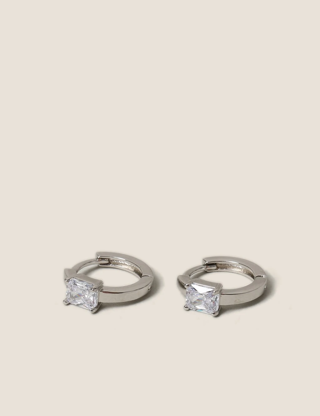 925 Sterling Silver huggie hoops featuring cubic zirconia stones.