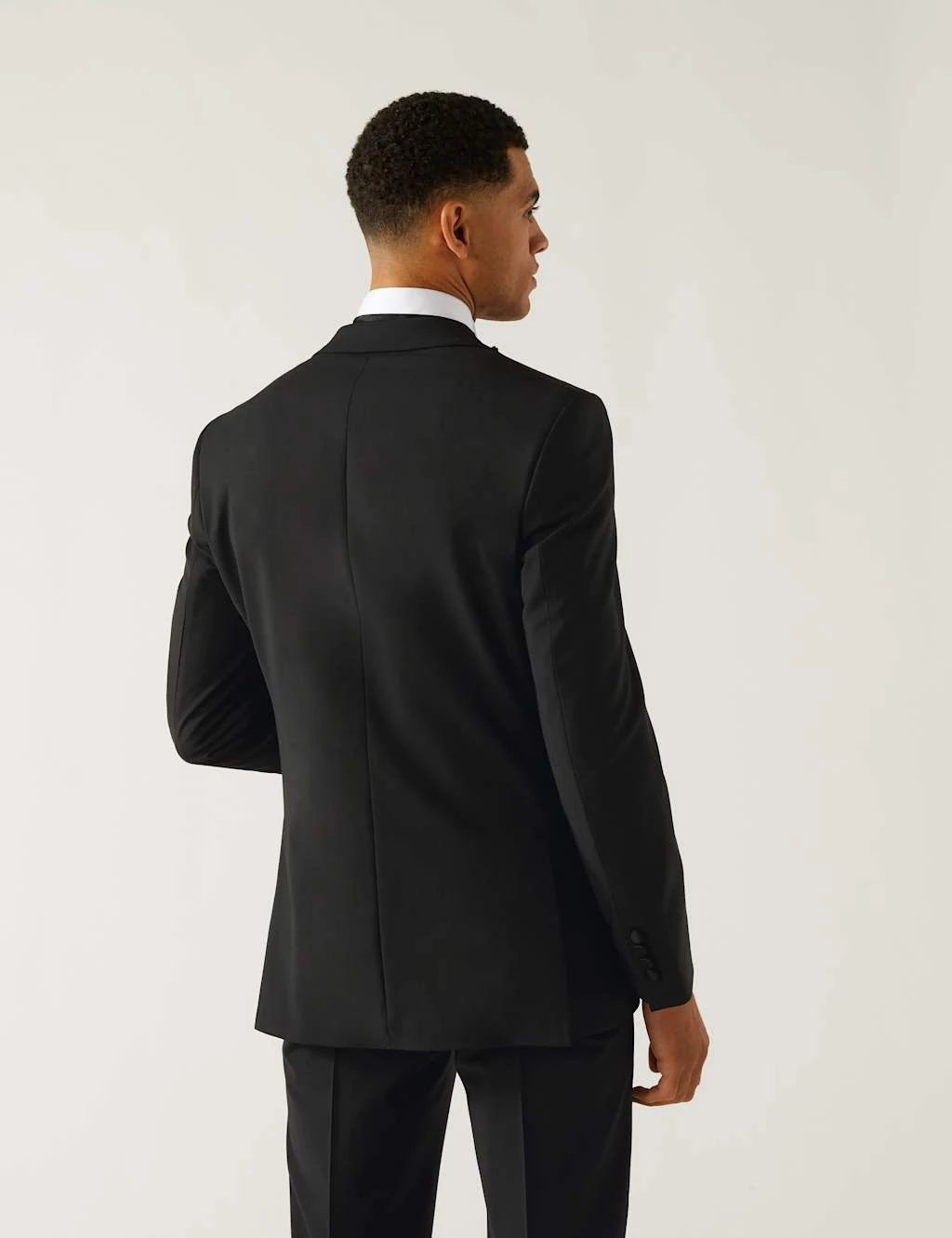 This wool-blend tuxedo jacket creates a sharp look without sacrificing comfort. Cut in a traditional tailored fit, the single breasted design features two vents and a one-button fastening for a classic feel. The stretchy fabric is designed to move with you and is also crease-resistant, thanks to Bounceback technology. Plus, you can stay dry in a shower due to the water-resistant finish. Made with recycled polyester.