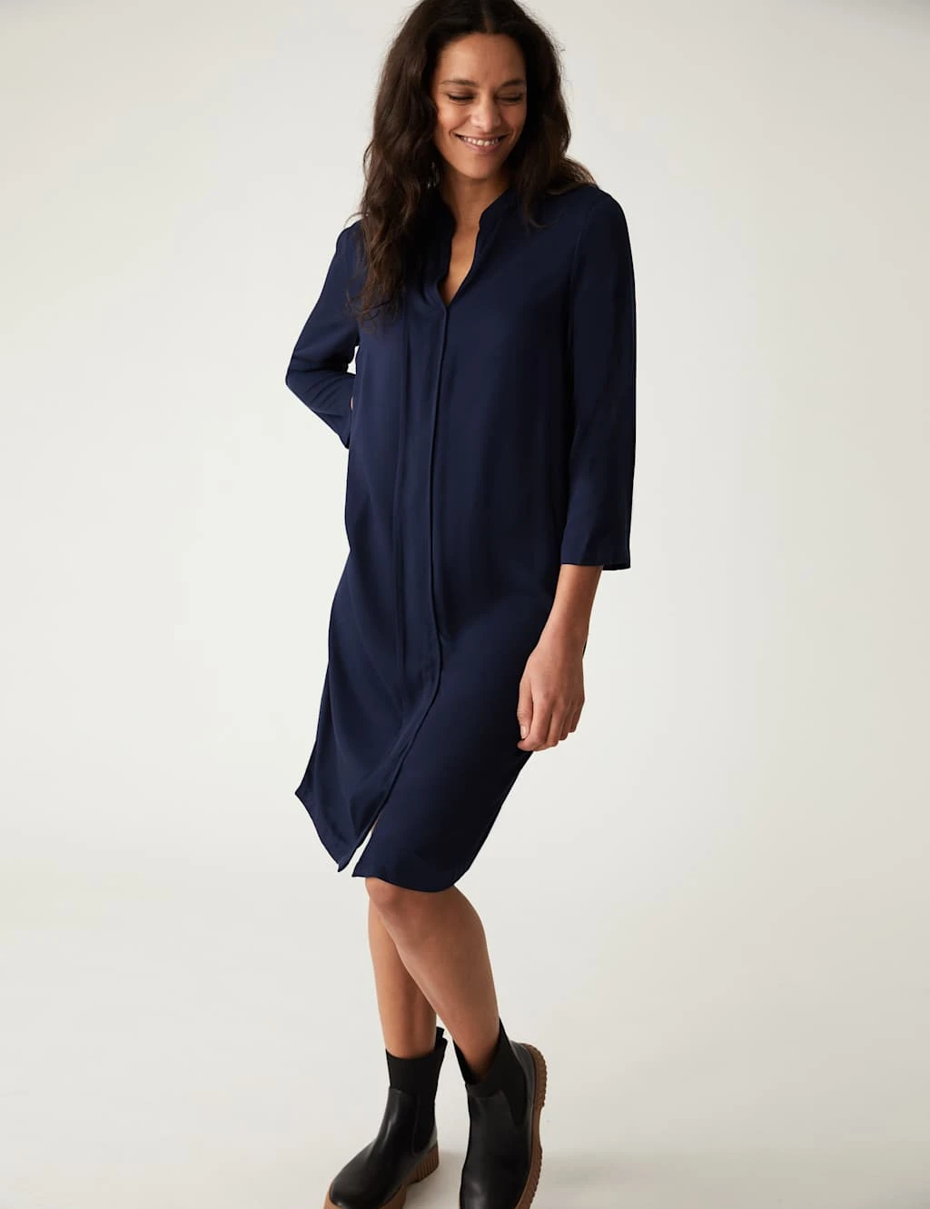 This classic shift dress is a true wardrobe essential. It’s made to a regular fit with a button fastening and a sophisticated knee-length hem. The three-quarter sleeves give a contemporary feel, while the v-neck adds an extra touch of femininity.