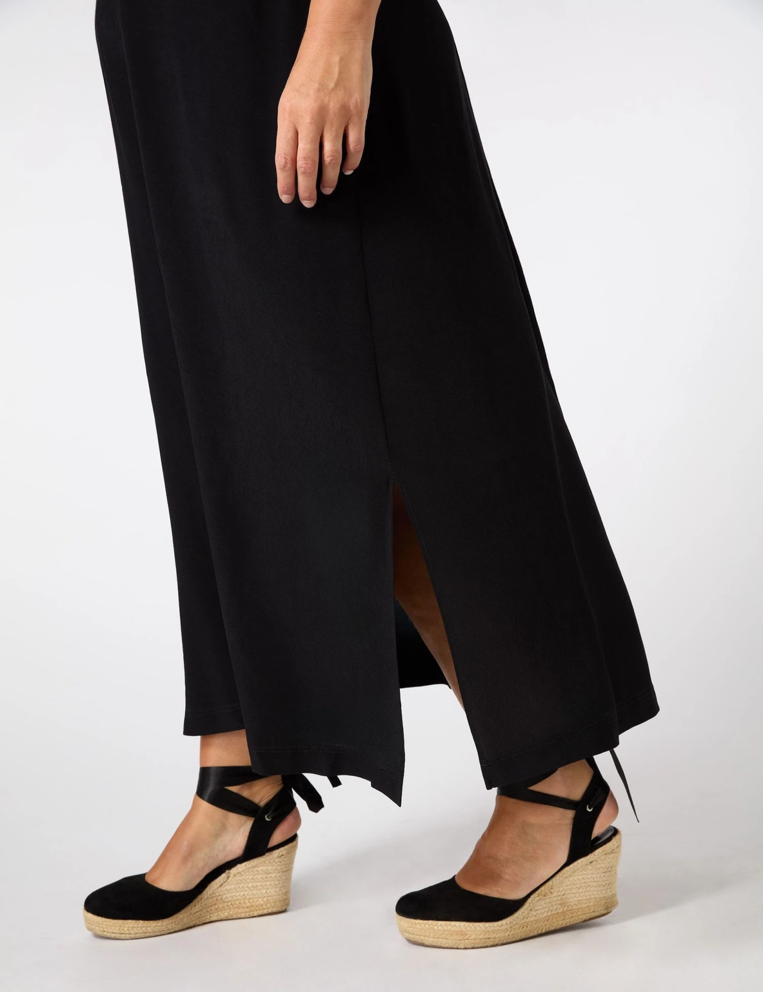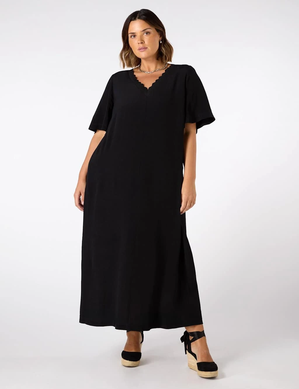 Scallop detailing on the v-neckline gives this Live Unlimited London t-shirt dress a feminine feel. It’s cut in a comfy regular fit, with flattering short angel sleeves. A side split in the maxi-length hem ensures effortless movement, while side pockets add a handy finish.