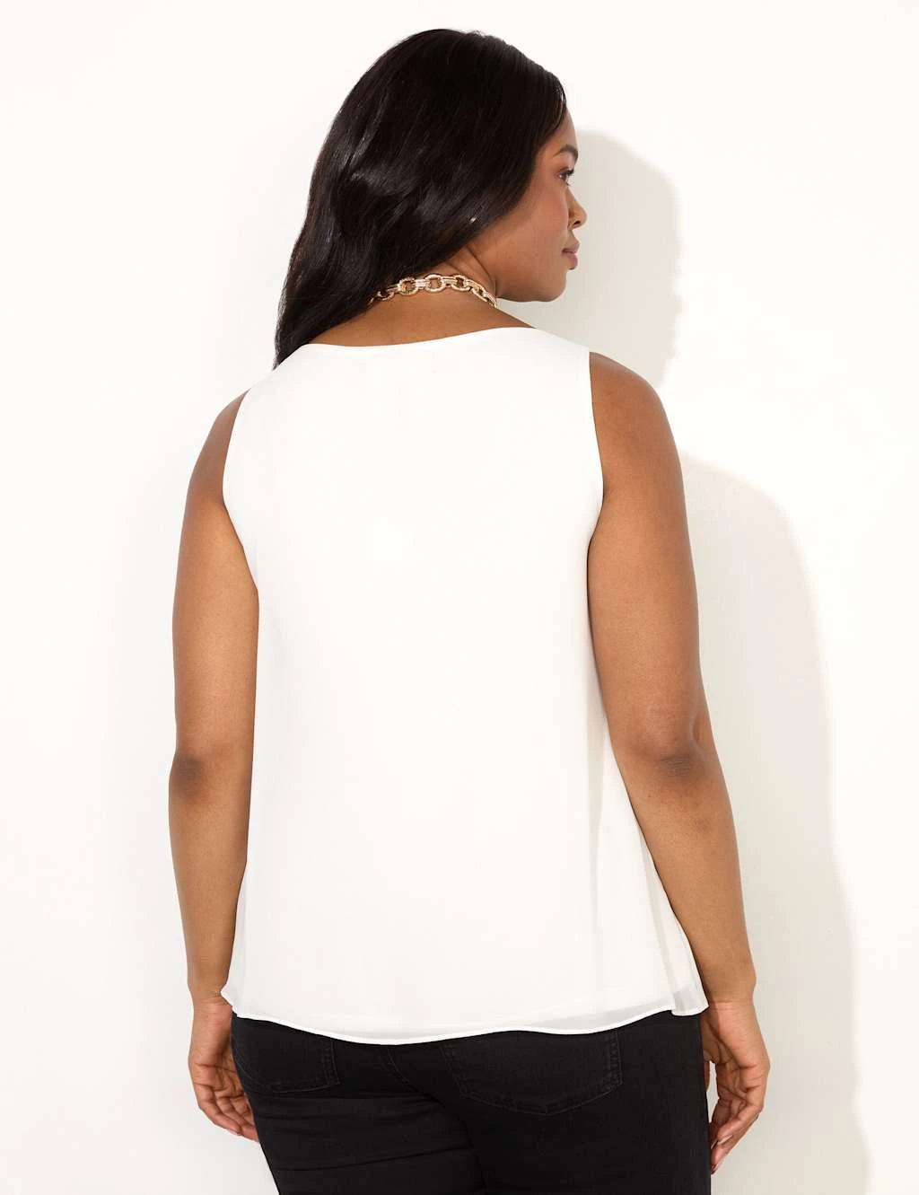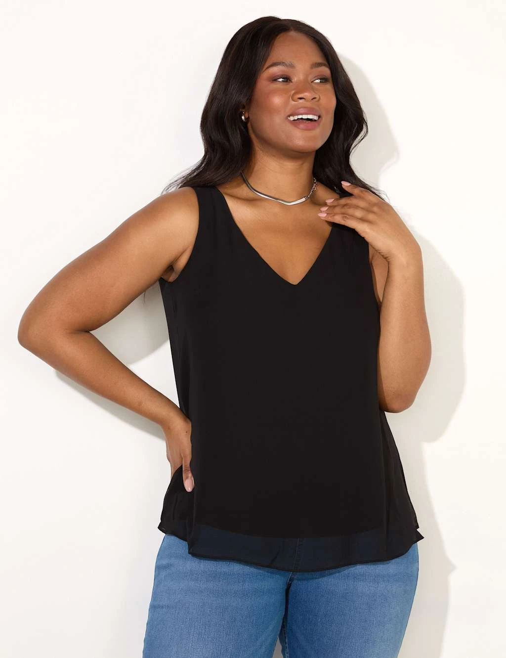 This versatile vest top by Live Unlimited London is crafted from chiffon for a graceful drape. It’s cut in a regular fit, with a flattering v-neckline and a swing shape. It’s lined with soft jersey and has a dipped hemline for extra coverage.