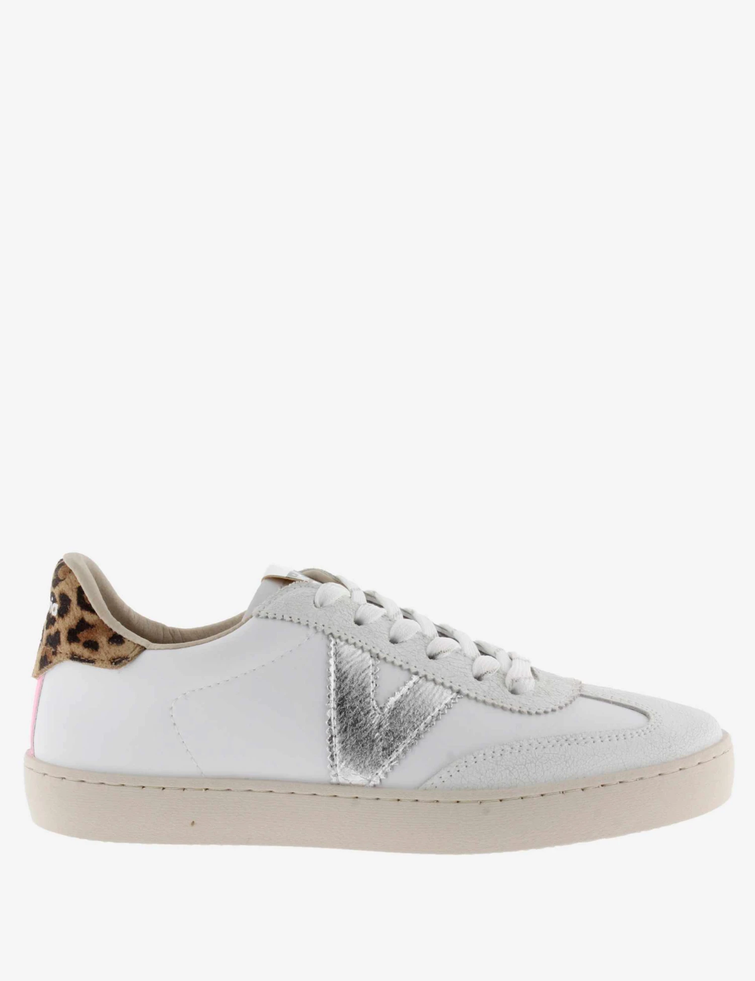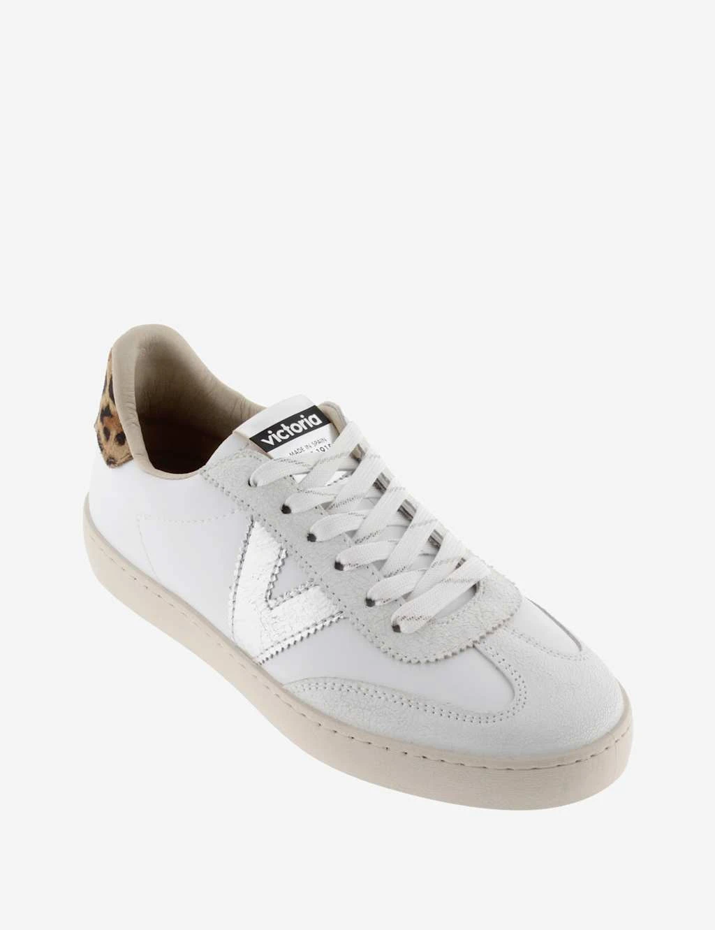 Add a touch of texture to your casual looks with these leather trainers by Victoria. The lace-up upper is decorated with a metallic logo and animal print panel at the back. These trainers have a chunky, flat sole for a modern silhouette.