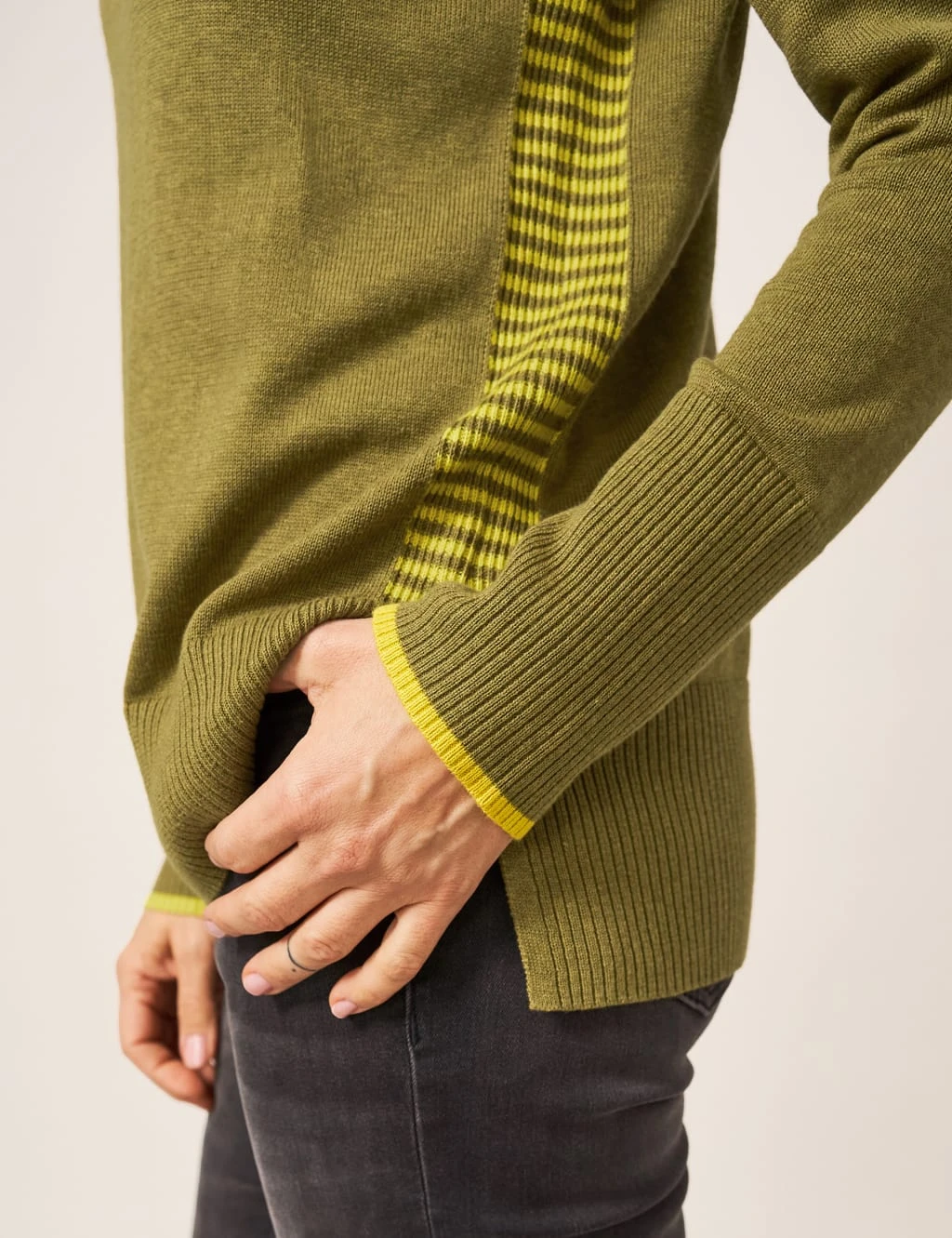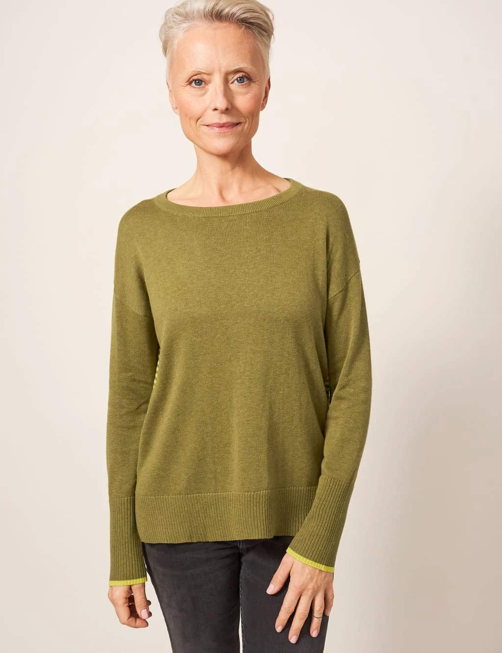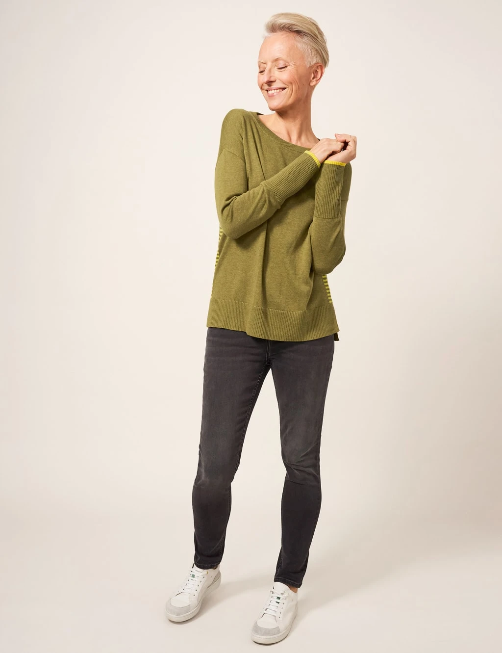 Knitted from an organic cotton blend, this White Stuff jumper has a luxuriously soft feel. It’s made in a comfy regular fit with a classic crew neck and ribbed trims. Colour-pop stripes at the sides, cuffs and inside collar add extra charm.