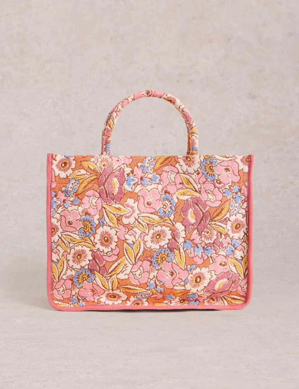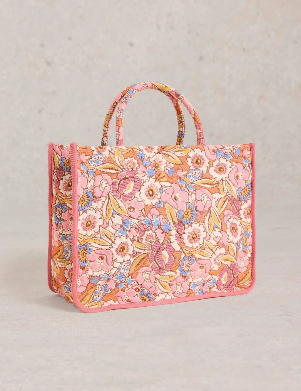 This rectangular tote bag from White Stuff is a bright and cheerful piece for sunny days. It’s made from cotton-blend jacquard fabric with a nostalgic floral pattern. There are two top handles and a spacious main compartment for your essentials. A smaller internal pocket is perfect for smaller items and the contrasting dotty lining provides extra fun. This bag has a convenient magnet fastening.