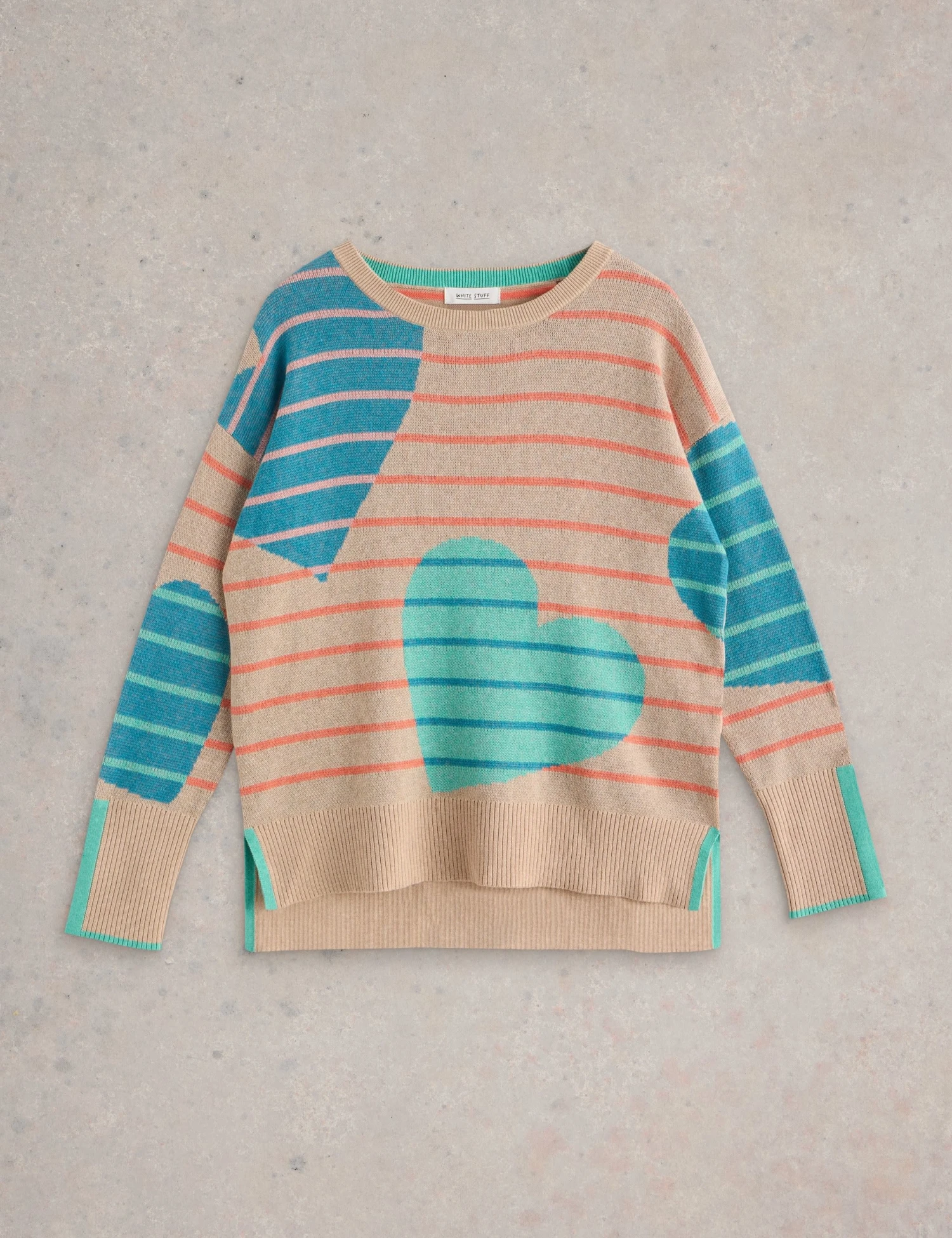 This cotton-rich blend women’s jumper from White Stuff is the perfect way to add some fun to your knitwear collection. It’s made in an easy regular fit with a timeless crew neck pullover design. This cosy sweater features a playful heart pattern and print on the front with contrasting stripes.